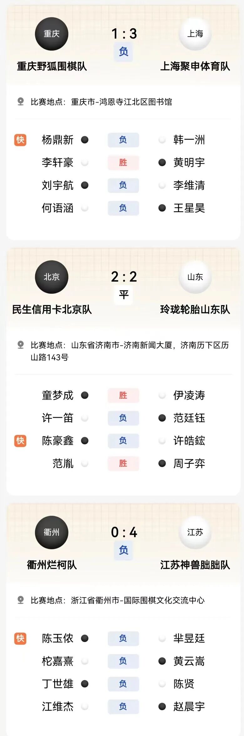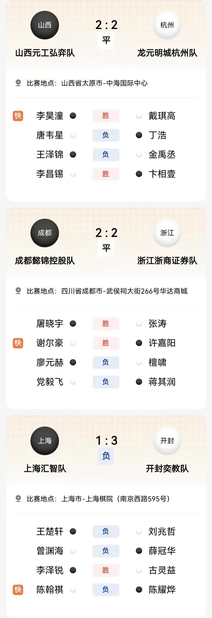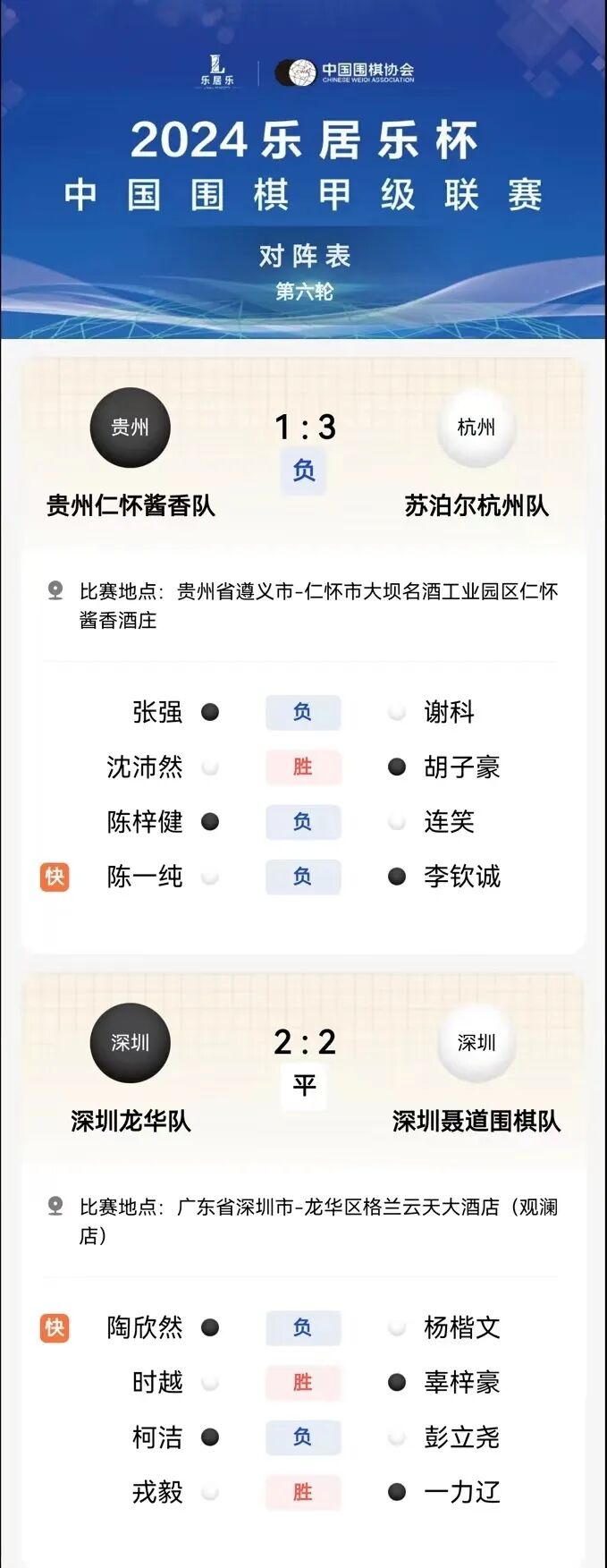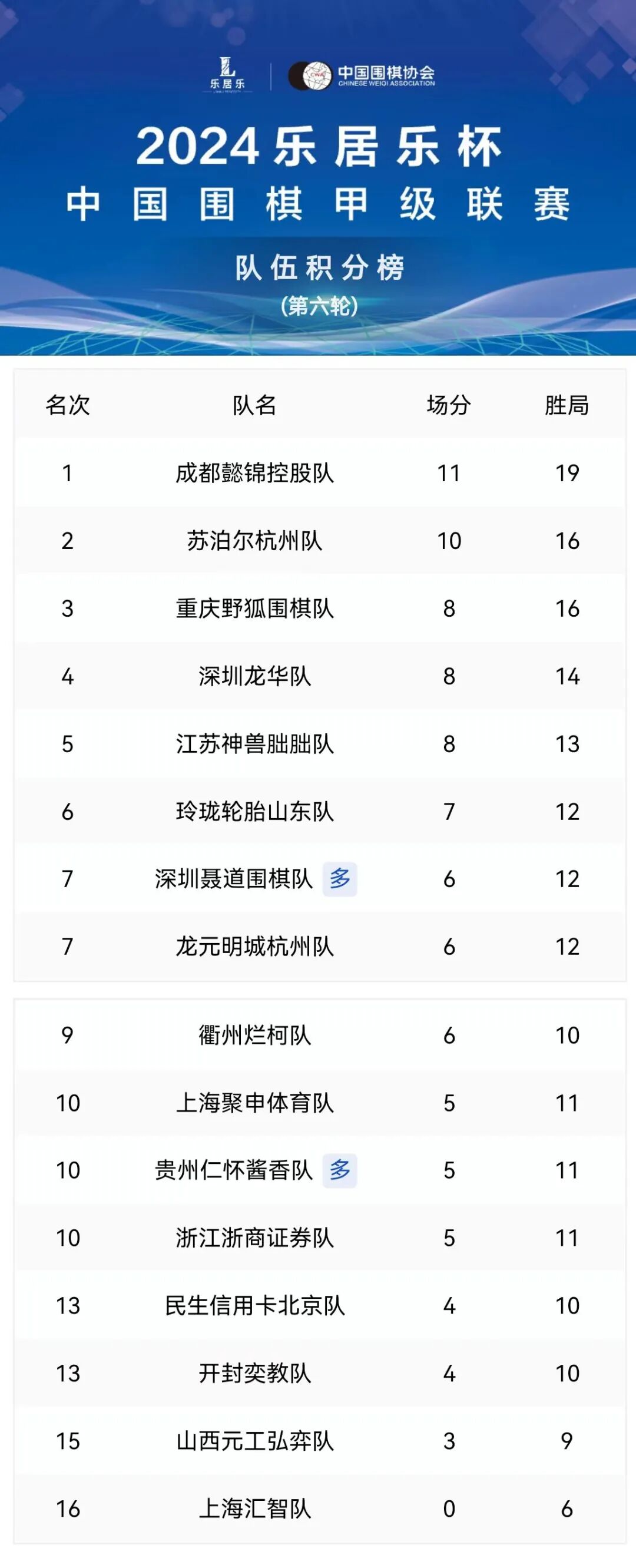 6月23日,2024乐居乐杯中国围棋甲级联赛第六轮比赛在各主场结束。成都懿锦控股队战平浙江浙商证券队,依然领跑积分榜;苏泊尔杭州队3:1胜贵州仁怀酱香队,排名升至榜眼。山西元工弘弈队主场战平龙元明城杭州队,24年来(2001年开始引入外援)围甲联赛首次出现外援之间对局,李昌锡小胜卞相壹;金禹丞速胜王泽锦跨赛季19连胜,追平联赛记录。此前5连胜的领头羊成都懿锦控股队主场遭浙江浙商证券队阻击,2:2战平后减缓领先势头。重庆野狐围棋队1:3不敌上海聚申体育队,让出榜眼位置。实力强大的苏泊尔杭州队获胜升至第二位。深圳德比战柯洁不敌彭立尧、辜梓豪负于时越,深圳龙华队2:2战平深圳聂道围棋队。山西元工弘弈队主场迎战上赛季亚军龙元明城杭州队。金禹丞速胜王泽锦,本赛季6战全胜、跨赛季19连胜,追平跨赛季最高连胜纪录。此前,一代王者、韩国外援李世石九段曾在2007-2009三个赛季总共19连胜。金禹丞胜王泽锦后,本场快棋才结束,李昊潼执黑胜戴琪高,祝主队扳平比分。一场跌宕起伏、几经反复的世界冠军大战,最终唐韦星官子“打勺”负于丁浩。两位韩国外援李昌锡与卞相壹的对局最晚结束,这是围甲联赛自创办以来首次出现外援之间对局。2001年开始允许引入外援后,规定外援与外援不能相遇,如排阵时相遇,则客队外援的台次自动下调。今年联赛不再有此规定,经过5轮比赛之后,今天首次出现外援之间的对局。结果卞相壹继续一胜难求,遭李昌锡逆转连败。