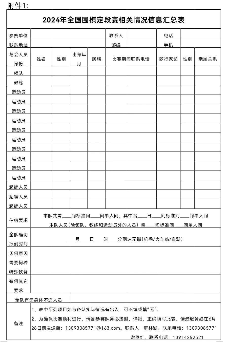 2024年全国围棋定段赛将于2024年7月10日至19日在江苏省无锡市举行。现将有关事项补充通知如下:请以下人员在规定时间内到无锡中威蓝海御华大饭店报到:航班抵达无锡苏南硕放国际机场后,从机场乘出租车约40分钟到达,费用80元。(1)无锡火车站(城站)乘出租车约25分钟到达,费用约35元。(2)无锡东站(高铁站)乘出租车约40分钟到达,费用约65元。汽车客运中心乘出租车约25分钟到达,费用约35元。沪宁高速公路——无锡北出口下——锡澄路——文惠路——吴韵路路口即到江苏省无锡中威蓝海御华大饭店(无锡市惠山区吴韵路589号)。5、无锡中威蓝海御华大饭店总机:0510-83583333(24小时)组委会将于7月10日晚上20:00召开各参赛队的领队会议,地点:无锡中威蓝海御华大饭店三楼映山堂。领队会上,将确认各队参赛名单,请各队务必派代表参加。凡未在领队会上签到确认的棋手,将不能确保顺利参赛。比赛期间大会统一安排食宿,因场地原因,住宿共安排3个酒店,分别为:无锡中威蓝海御华大饭店、白玉兰酒店(无锡惠山万达广场店)、全季无锡惠山区堰桥经开区酒店。报到地点及赛场为:无锡中威蓝海御华大饭店。比赛期间的参赛费用自理,参赛费用包括食宿费及场地、器材使用费等。标准为:地址:无锡市惠山区政和大道202号(距离无锡中威蓝海御华大饭店赛场约700米,步行约10分钟,比赛期间有车辆接送)。地址:无锡市惠山区堰裕路999号(距离无锡中威蓝海御华大饭店赛场约2.7公里,开车约8分钟,比赛期间有车辆接送)。备注:无锡中威蓝海御华大饭店优先安排2023年全国围棋定段赛青少年男子组前120名、青少年女子组前80名和2024年全国围棋定段赛培训单位的运动员。其他运动员安排在另外两个酒店,自行选择,根据汇款时间先到先得。(一)根据赛程安排(见附件4)初赛阶段的缴纳食宿费用:青少年男子组、青年男子组6天(7月10日至16日6晚住宿,10日晚餐至16日中餐);其他组别5天(7月10日至15日5晚住宿,10日晚餐至15日中餐);成人女子组含复赛费用,未进复赛者退相应费用。(三)请各参赛单位和棋手根据参赛组别按照以下方式将赛事服务费、选择入住酒店食宿费于6月28日20:00前汇至指定账户。(四)汇款或转账成功后请短信告知指定手机13093085771,注明汇款代表队、人数及金额,短信格式:汇款代表队+款项一+款项二+人数+金额。同时将《参赛信息汇总表》发至:13093085771@163.com。组委会核对款项和《参赛信息汇总表》后,在24小时内回复电话或短信确认。报到时请凭汇款或转账的单据领取相关资料及证件。提前到达的,请增加相应天数费用。(一)为确保参赛人员安全和比赛顺利进行,比赛期间大会统一安排食宿,酒店客房须按房型核定人数标准入住,不得超人数同住。若发现实住人数超前台登记入住人数,处双倍房费罚金。如因住宿情况造成无法参赛的,组委会概不负责。(二)参赛选手的家长和护理人员不得担任领队或教练,不得进入赛场。(四)参加定段赛的棋手请自备1寸或2寸照片2张,以备定段后办理职业棋手段位证。(五)请参加本次比赛的所有人员在报到前自行购买比赛期间的《人身意外伤害保险》。参加比赛的人员在比赛期间如发生人身意外损害和财产损失,组委会不承担赔偿责任,由受损害人依据法律规定和本声明自行解决。(六)各参赛单位对酒店饮食或其他方面有特别要求的,请在《参赛信息登记表》上注明。(七)各参赛单位将赛事服务费、食宿费汇款至指定账户后,参赛棋手由于自身原因无法到达无锡参赛的,食宿费扣除1天,赛事服务费不予退还。(八)比赛期间实行领队责任制,各领队负责本队教练和参赛棋手在比赛期间的交通安全、人身安全、食品安全、赛风赛纪、舆情管控、联络沟通等工作。各领队负主要责任、现场负责人负直接责任。(九)参赛运动员报到时需提交提前打印并签署的《2024年全国围棋定段赛赛事免责声明书》、《运动员赛风赛纪承诺书》(见附件)到酒店大厅报到处完成报到。