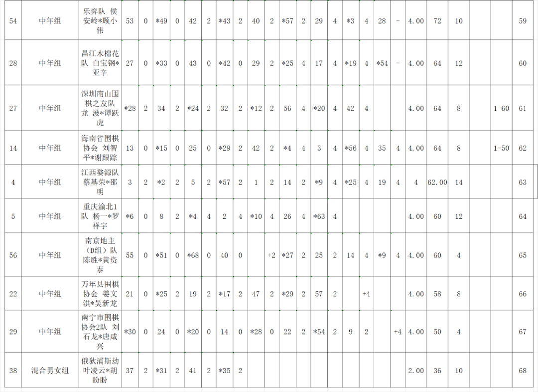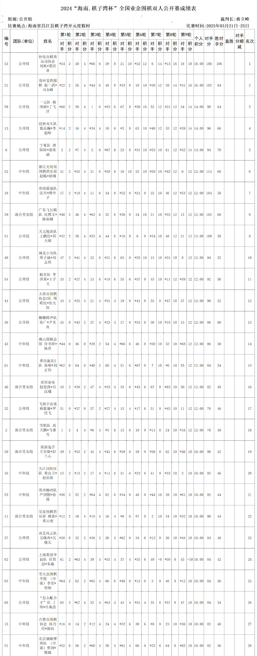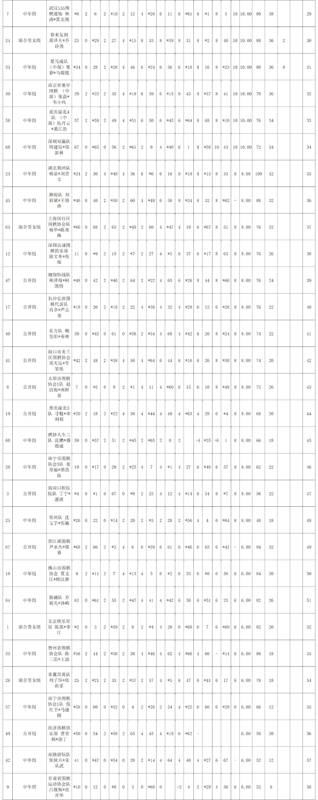 比赛吸引了包括10名职业棋手在内的来自全国136名围棋高手参与,最终来自湖南省怀化市棋类运动协会的刘秋/梁洪章九连胜夺得公开组冠军;来自浙江光明顶围棋俱乐部的赵栋/徐晹获得中年组冠军;来自广东飞行棋队的匡博文/陈依晴获得男女混合组第一名。