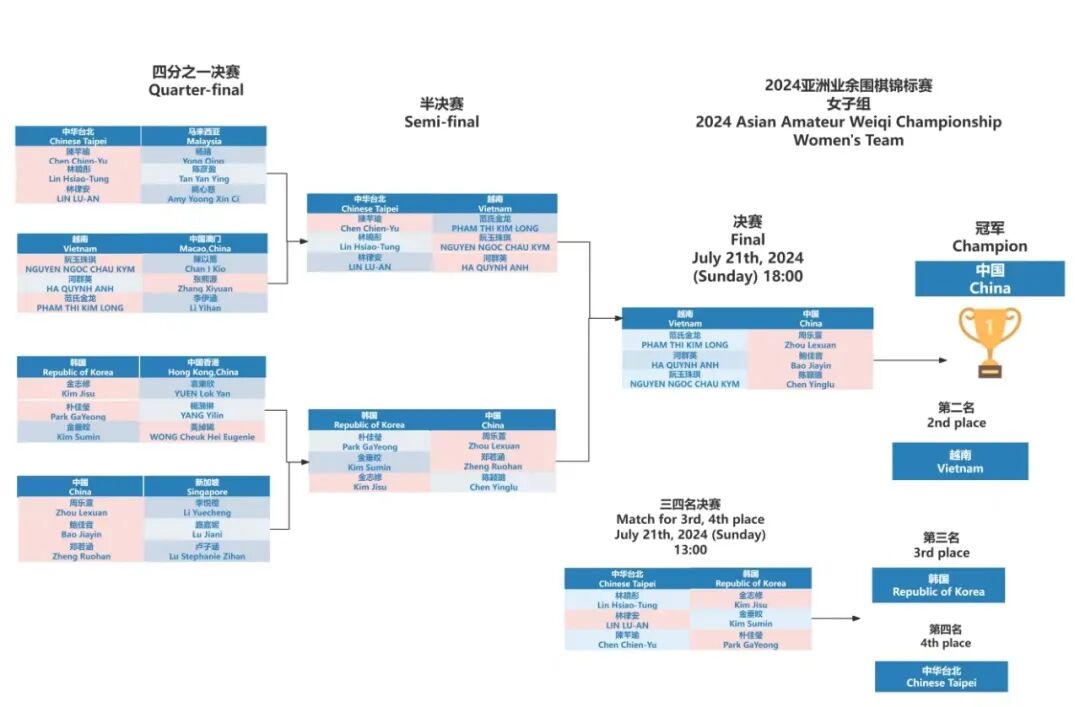 北京时间7月15日晚,2024亚洲业余围棋锦标赛决赛在弈客围棋进行。中国男队以3:2的比分战胜中华台北男队,中国女队3:0完胜越南女队,包揽本届赛事男、女团冠军。