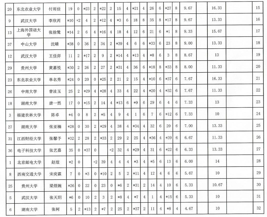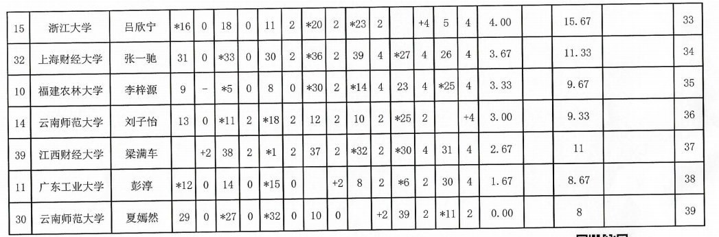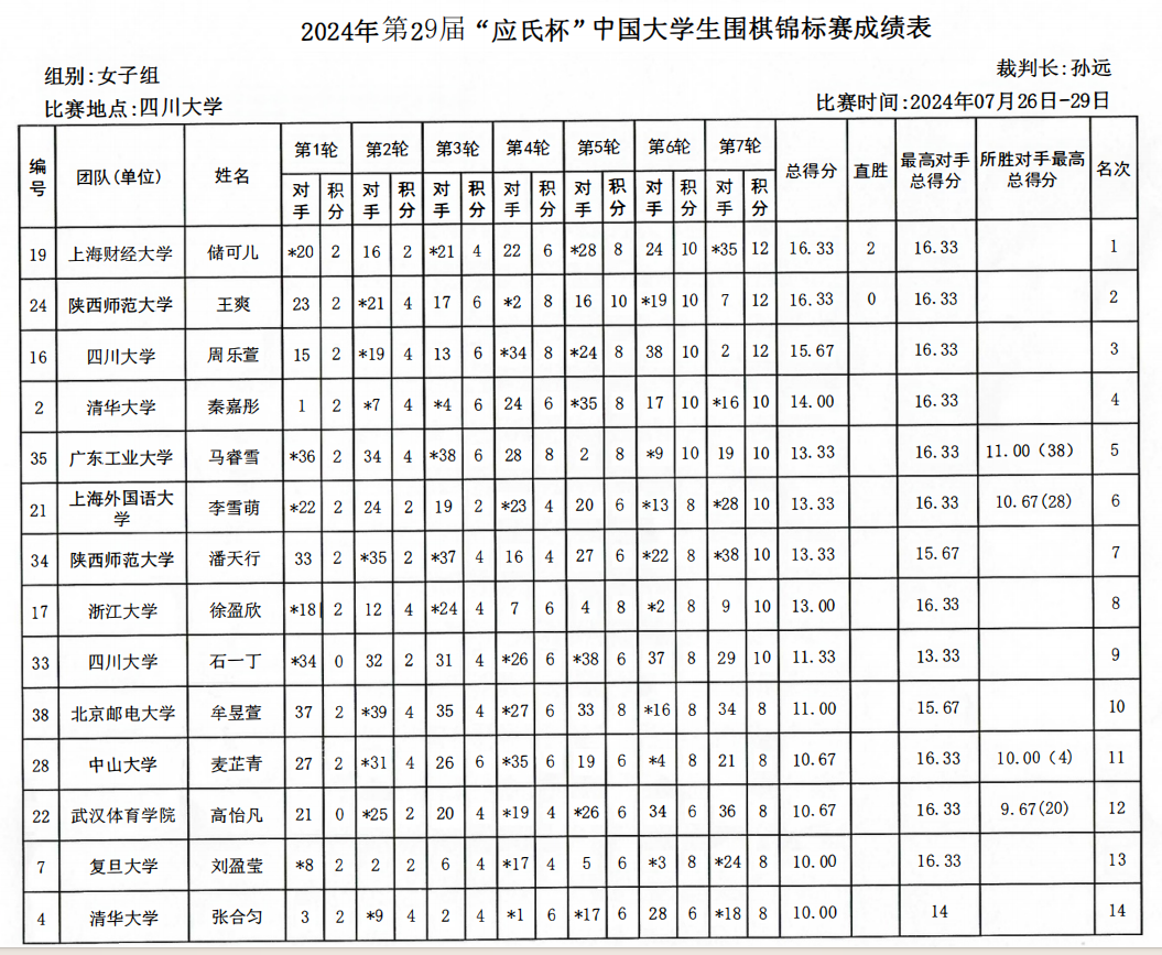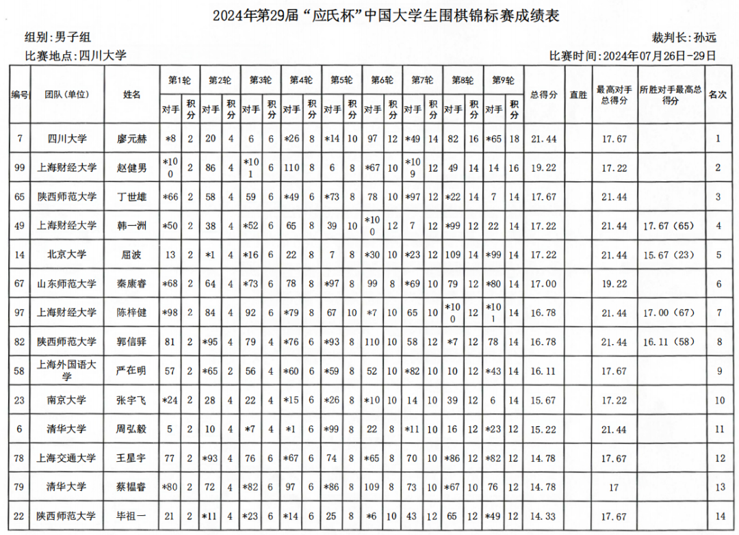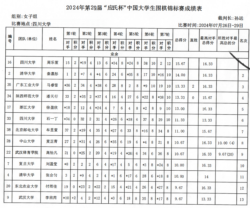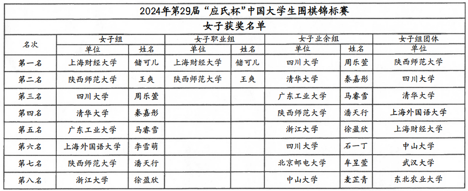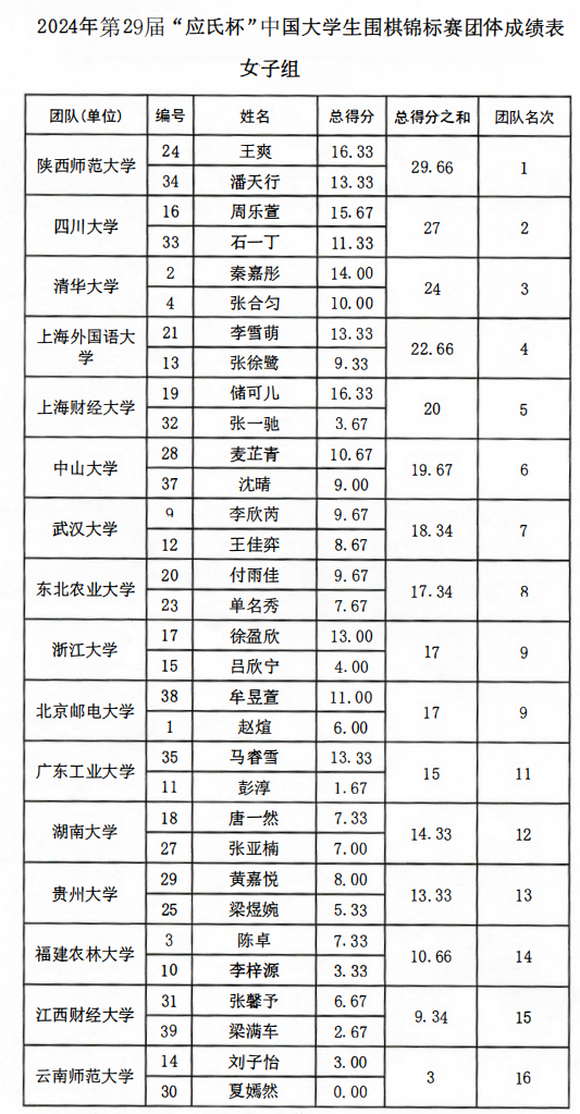 2024年“应氏杯”全国大学生围棋锦标赛成绩表