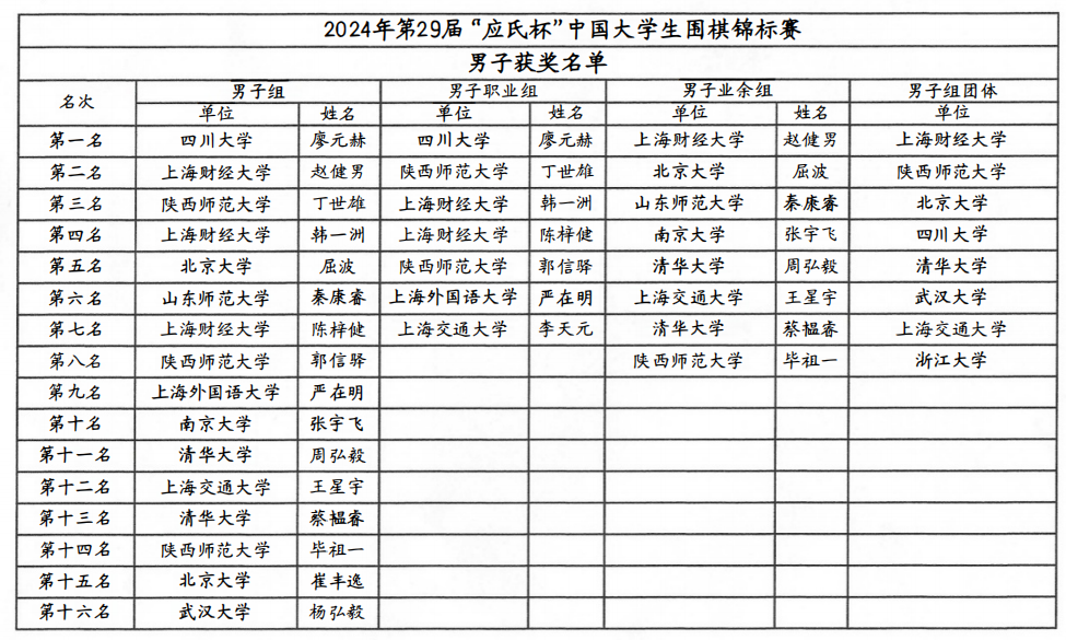 7月29日,2024年“应氏杯”全国大学生围棋锦标赛在四川大学闭幕。上海财经大学获得男子组团体冠军,四川大学的廖元赫获得男子职业组冠军,上海财经大学的赵健男获得男子业余组冠军;陕西师范大学获得女子组团体冠军,上海财经大学的储可儿获得女子职业组冠军,四川大学的周乐萱获得女子业余组冠军。男子职业组1-7名的是:四川大学的廖元赫、陕西师范大学的丁世雄、上海财经大学的韩一洲、上海财经大学的陈梓健、陕西师范大学的郭信驿、上海外国语大学的严在明、上海交通大学的李天元。男子业余组1-8名的是:上海财经大学的赵健男、北京大学的屈波、山东师范大学的秦康睿、南京大学的张宇飞、清华大学的周弘毅、上海交通大学的王星宇、清华大学的蔡韫睿、陕西师范大学的毕祖一。男子组团体1-8名的是:上海财经大学、陕西师范大学、北京大学、四川大学、清华大学、武汉大学、上海交通大学、浙江大学。女子职业组1-2名的是:上海财经大学的储可儿、陕西师范大学的王爽。女子业余组1-8名的是:四川大学的周乐萱、清华大学的秦嘉彤、广东工业大学的马睿雪、陕西师范大学的潘天行、浙江大学的徐盈欣、四川大学的石一丁、北京邮电大学的牟昱萱、中山大学的麦芷青。