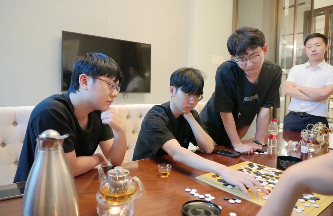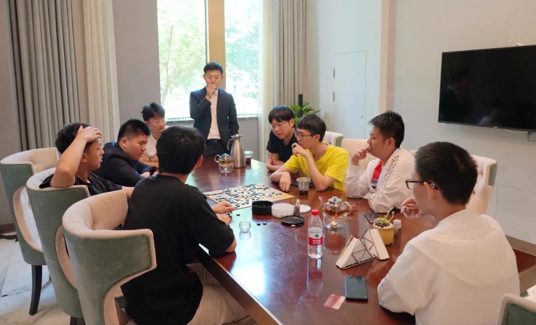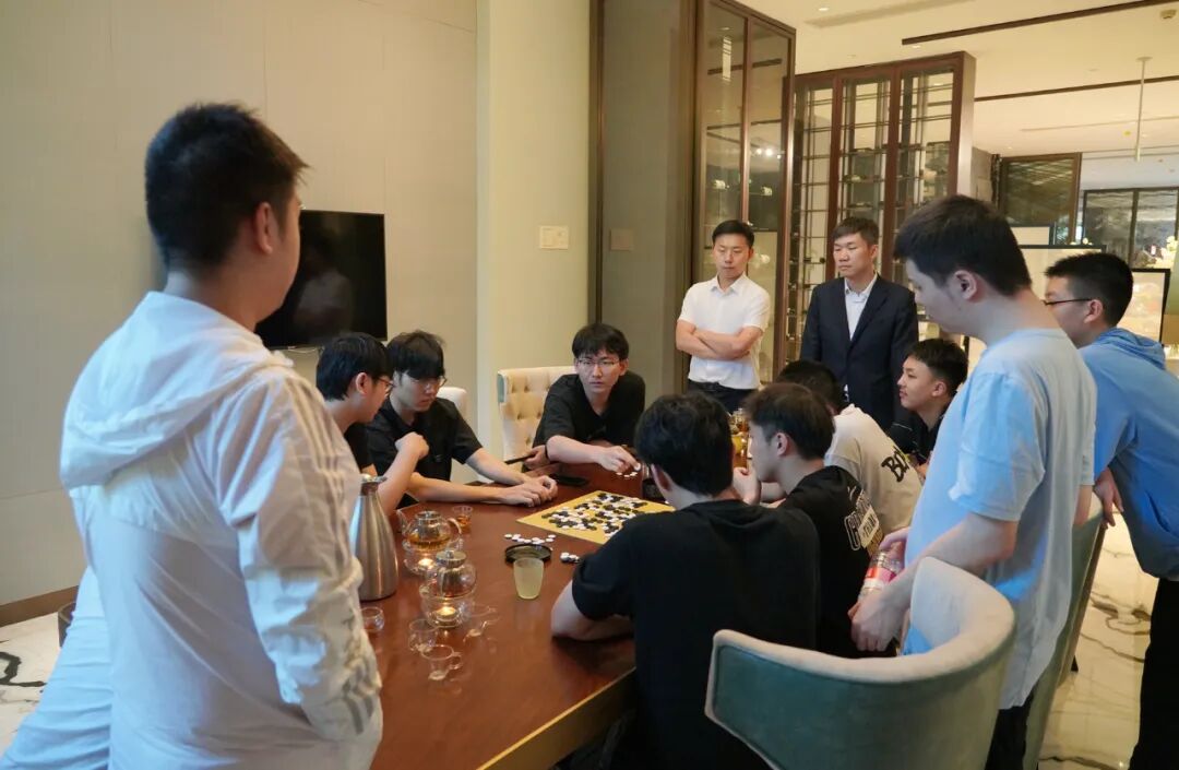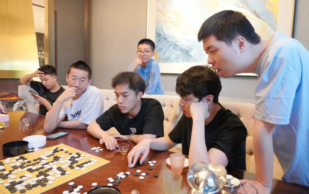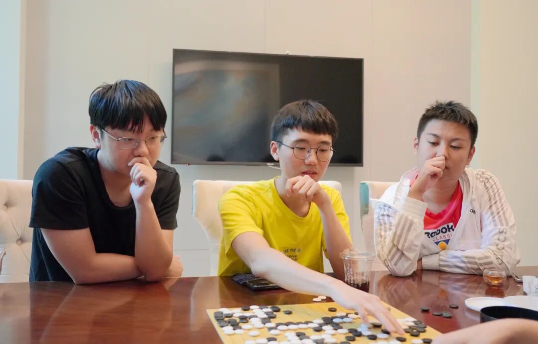 今天是比赛休息日,午饭后,苏泊尔杭州队、龙元名城队的队员们相聚在比赛所在酒店的餐厅探讨棋艺。两队的韩国外援申真谞、卞相壹也参与其中,气氛浓烈,展现了围棋世界的奇妙之处:语言不通,但不影响交流棋技,不愧“手谈”美誉。两队是上个赛季半决赛的对手,一起训练研究,诠释了何为“场上是对手,场外是朋友”。