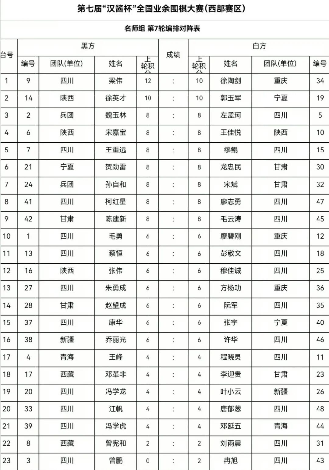 西部赛区覆盖8个省级单位,共有162名棋手参赛,其中6段以上(含)44人,7段4人,8段1人。名手组50人参赛,奖励前24名,颁发奖金及荣誉证书;参赛5段棋手达到50人,冠军授予业余6段证书(可顺延至前8名);前10名参加总决赛(如果放弃比赛,按照排名依次递补)。名师组50人参赛,奖励前16名,颁发奖金及荣誉证书;参赛4段棋手达到30人,冠军授予业余5段证书(可顺延至前8名);前10名参加总决赛(如果放弃比赛,按照排名依次递补)。名人组62人参赛,奖励前16名,颁发奖金及荣誉证书;参赛4段棋手达到30人,冠军授予业余5段证书(可顺延至前8名);前10名参加总决赛(如果放弃比赛,按照排名依次递补)。三个组均为7轮比赛。第7轮比赛将于9月2日上午结束,届时举行颁奖仪式暨闭幕式。