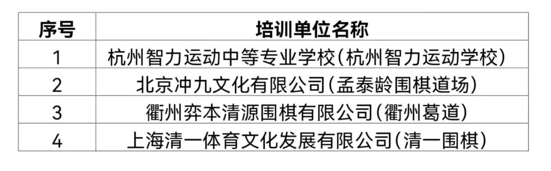 以上培训单位享受当年全国围棋定段赛单独组队报名的权利,不属于创建示范工作范畴,不开展评比表彰和授牌命名。