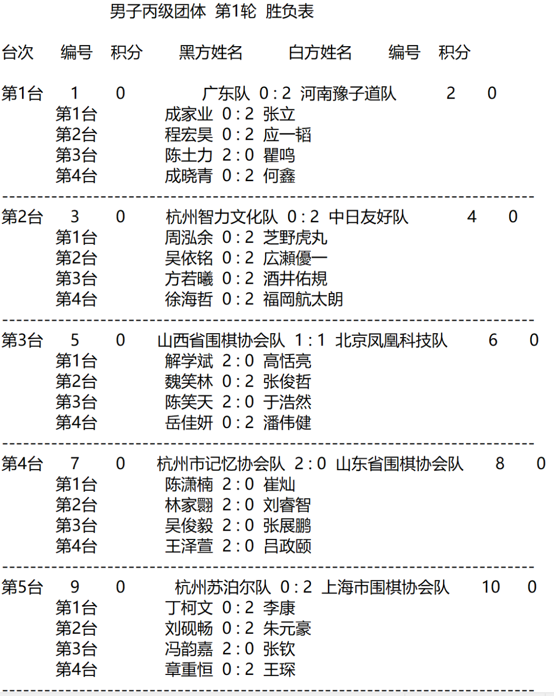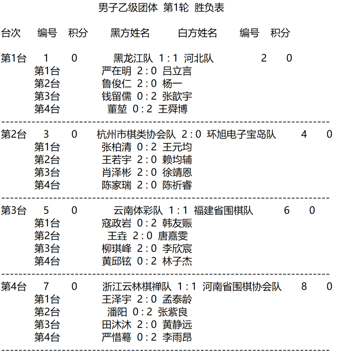 男子丙级团体赛第1轮赛果: