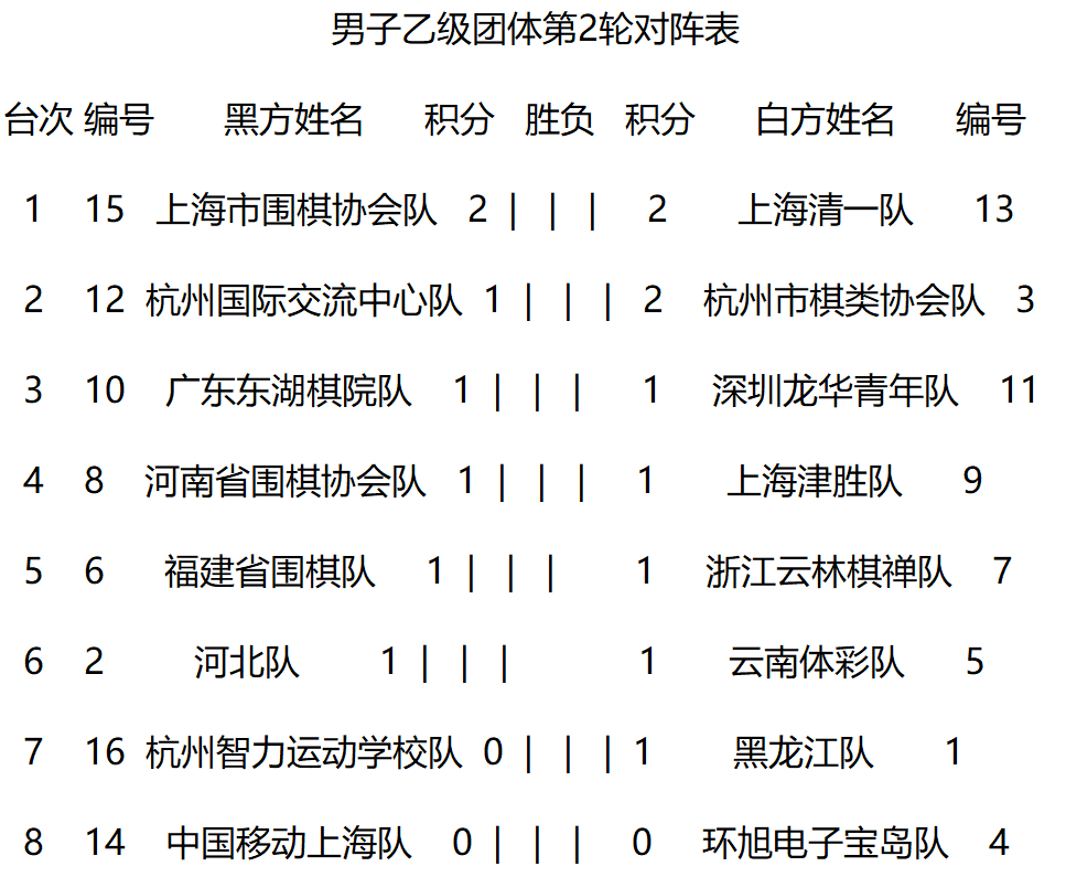 男子乙级团体赛第2轮对阵: