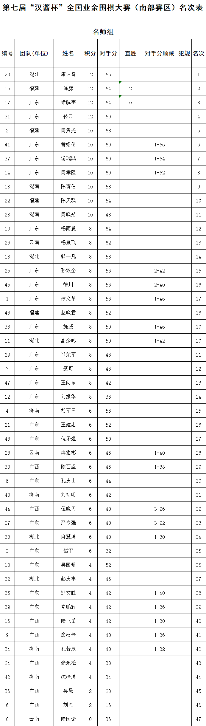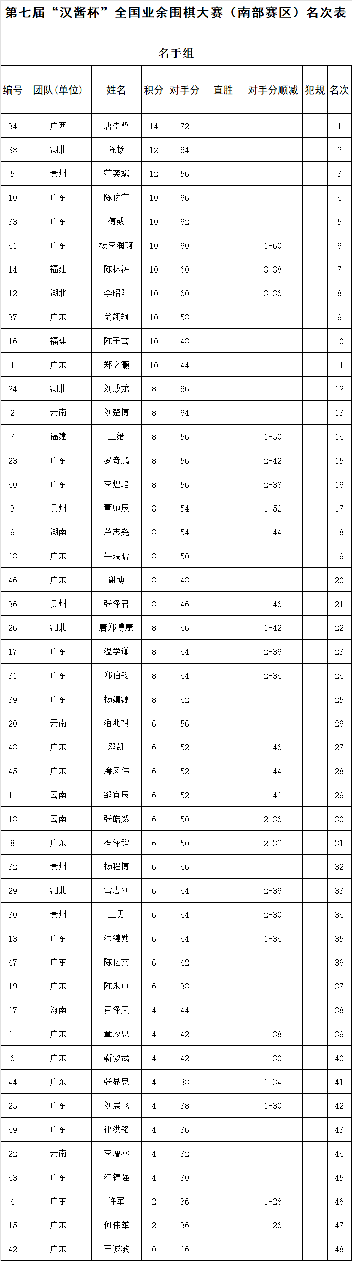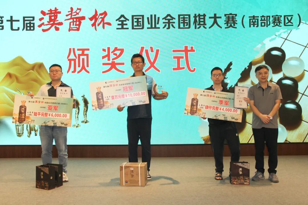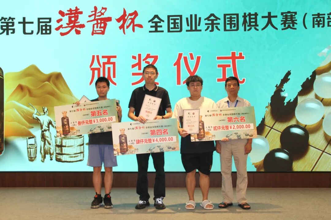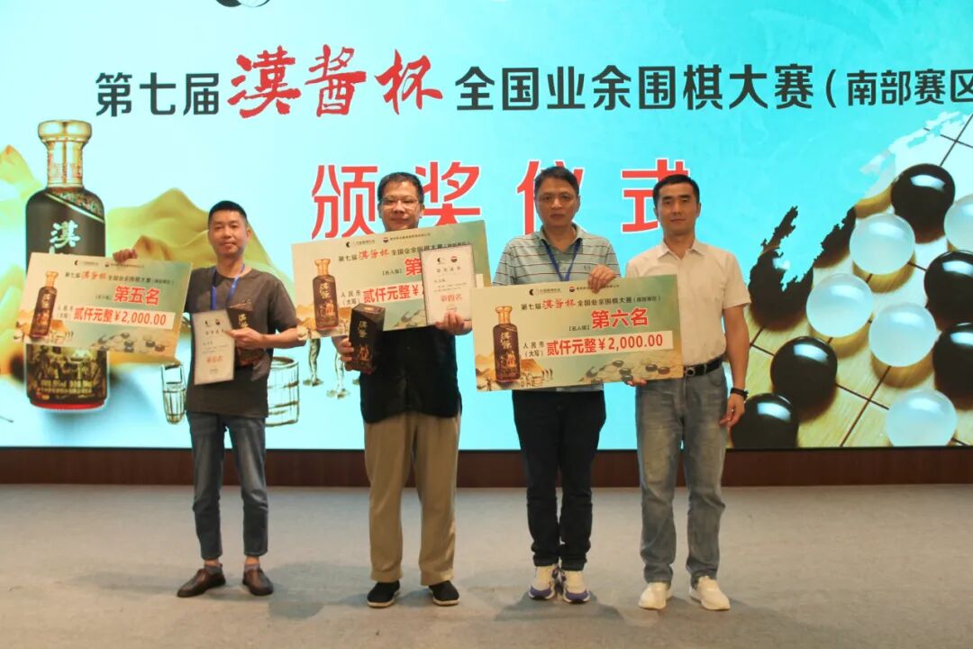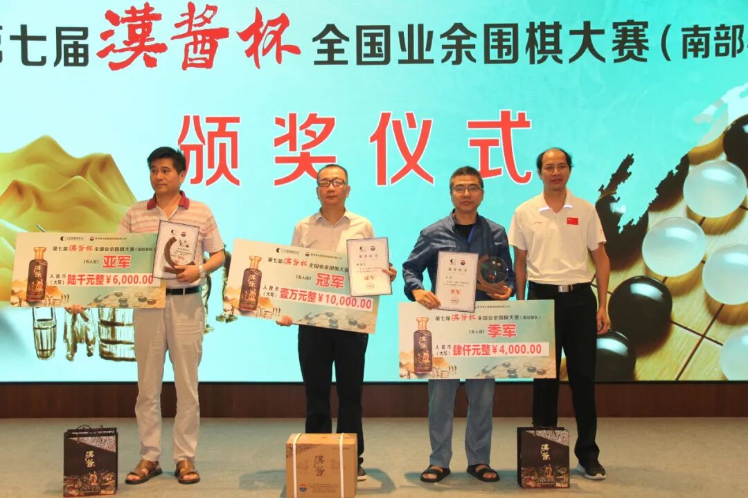 赛后举行了颁奖仪式暨闭幕式。中国围棋协会党支部书记、原副主席兼秘书长王谊,广东省围棋协会荣誉会长、中国围棋协会原副主席容坚行,中国围棋协会宣传文化部部长杨诚,广东省围棋协会荣誉会长陈志刚,广东省围棋协会副会长廖桂永,广东省围棋协会副会长兼秘书长邓广庭,贵州茅台酱香酒营销有限公司营销策划部田学其等出席闭幕式,并为获奖选手颁奖。名手组奖励前24名,颁发奖金及荣誉证书、奖励汉酱酒。其中冠军奖金30000元、汉酱酒6瓶,亚军奖金10000元、汉酱酒4瓶,季军奖金6000元、汉酱酒2瓶。名师组奖励前16名,颁发奖金及荣誉证书、奖励汉酱酒。其中冠军奖金10000元、汉酱酒6瓶,亚军奖金6000元、汉酱酒4瓶,季军奖金4000元、汉酱酒2瓶。名人组奖励前16名,颁发奖金及荣誉证书、奖励汉酱酒。其中冠军奖金10000元、汉酱6瓶,亚军奖金6000元、汉酱4瓶,季军奖金4000元、汉酱2瓶。各组前十名获得参加总决赛的资格。总决赛将于10月22-26日在山东省济南市举行。各组获奖名单如下:
