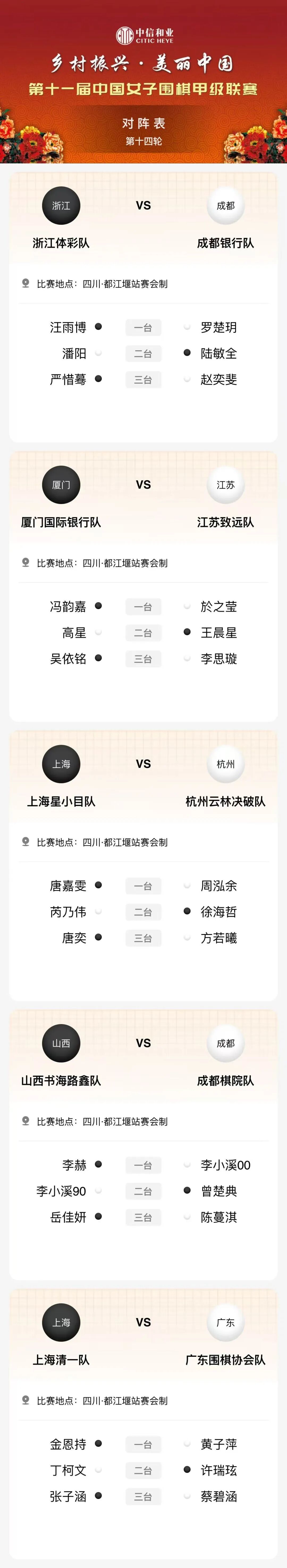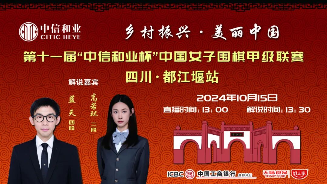 10月14日,2024年第十一届“中信和业杯”中国女子围甲联赛四川·都江堰站开幕式在都江堰市南桥广场举行。都江堰市委书记蒋蔚炜,中信和业党委书记、副董事长、总经理宋巍,中国围棋协会主席常昊先后致辞。明天上午将举行“希望围棋教室”捐赠仪式,中午12:00举行第14轮比赛,下午13:30蓝天四段、高若环二段将直播解说周泓余七段VS唐嘉雯六段的对局。