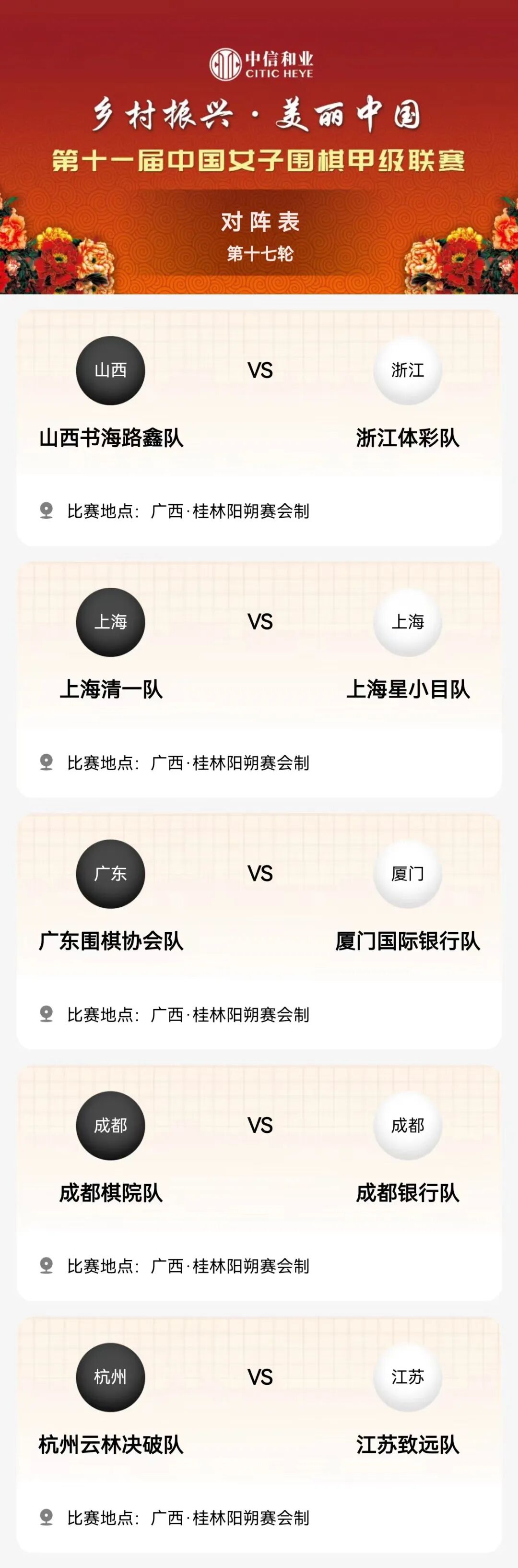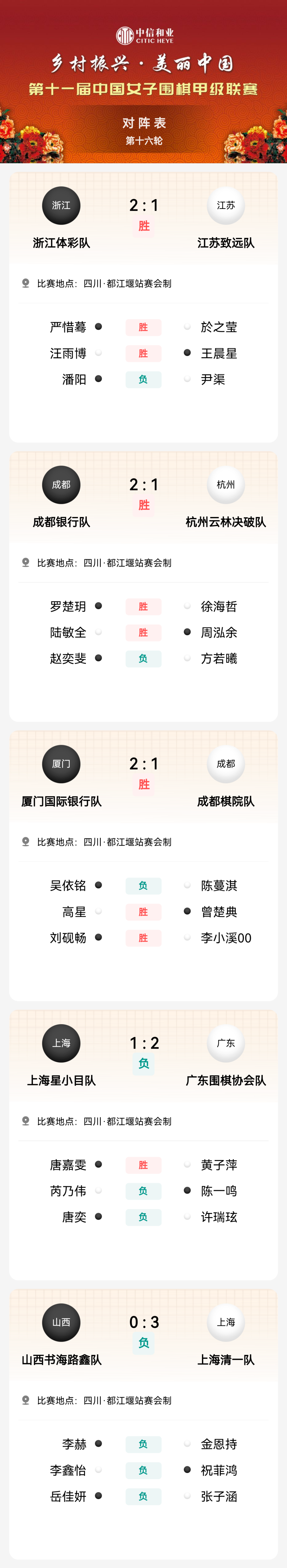 10月17日,2024年第十一届“中信和业杯”中国女子围甲联赛第16轮比赛在四川都江堰结束。本赛季多轮排名第二位的杭州云林决破队1:2不敌上轮提前夺冠的成都银行队,排名跌至第五位;厦门银行队2:1成都棋院队,以胜局数优势继续排名第二位;广东围棋协会队2:1力克上海星小目队升至第三位。联赛最后两轮比赛仍为赛会制,将于11月7日、8日在广西桂林阳朔举行,9日举行联赛闭幕式。