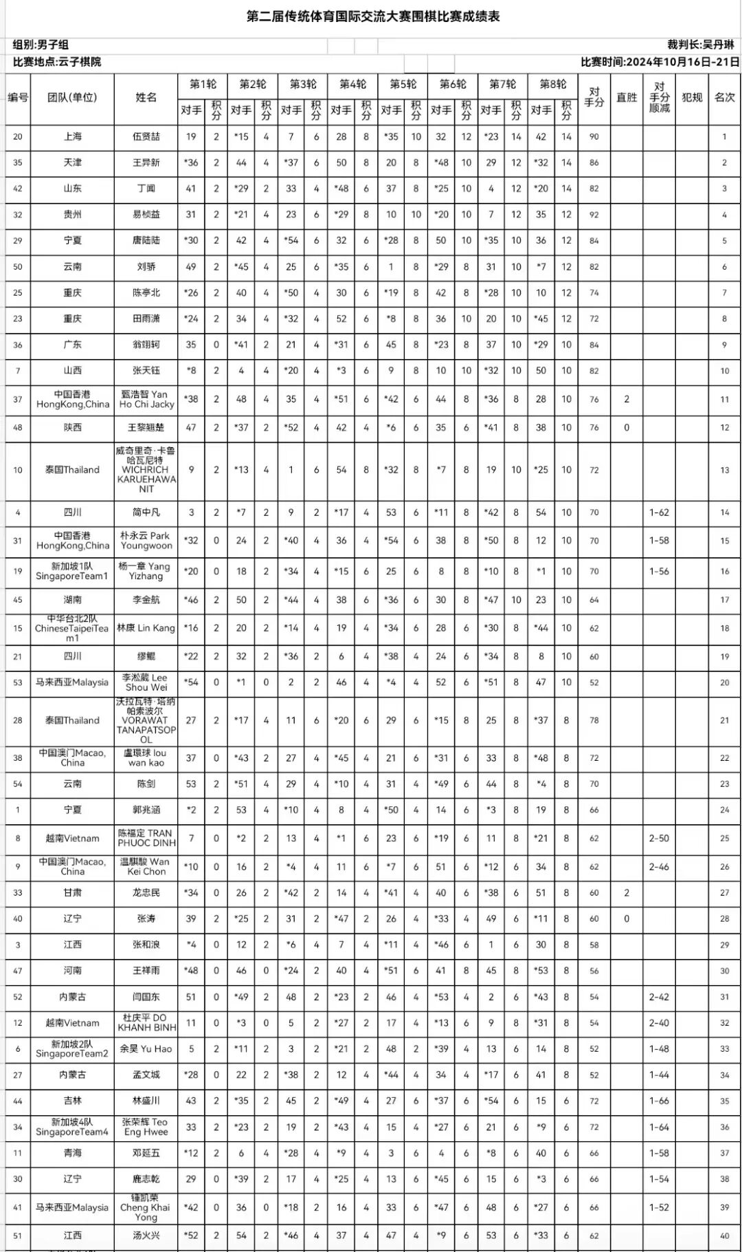 10月20日,第二届传统体育国际交流大赛围棋比赛在云南昆明云子棋院结束,四个组别排定名次。交流大赛也于今晚举行了闭幕式。第二届传统体育国际交流大赛由中华全国体育总会主办,国家体育总局对外交流中心、云南省体育局、昆明市人民政府共同承办。大赛选取在世界范围内开展较为广泛,具有中华文化特色,体现中华体育精神的传统体育项目。设围棋、武术、健身气功、舞龙舞狮4个竞赛项目。来自27个国家和地区的723名运动员报名参赛,其中境外参与人数为353人,境内参与人数为370人。围棋比赛由中国围棋协会协办。比赛设公开组男子个人赛、女子个人赛,海外组男子个人赛、女子个人赛。82人参赛。采用积分编排制,赛8轮。公开组男子个人赛和海外组男子个人赛分别录取前12名,颁发获奖证书、奖牌及奖金。冠军8000元;亚军6000元;季军3000元;第4-8名各2000元;第9-12名各1000元。公开组、海外组女子个人赛分别录取前6名,颁发获奖证书、奖牌及奖金。冠军6000元;亚军4000元;季军3000元;第4-6名各2000元。(奖金均为税前金额)第二届传统体育国际交流大赛围棋比赛男子组获奖名单: