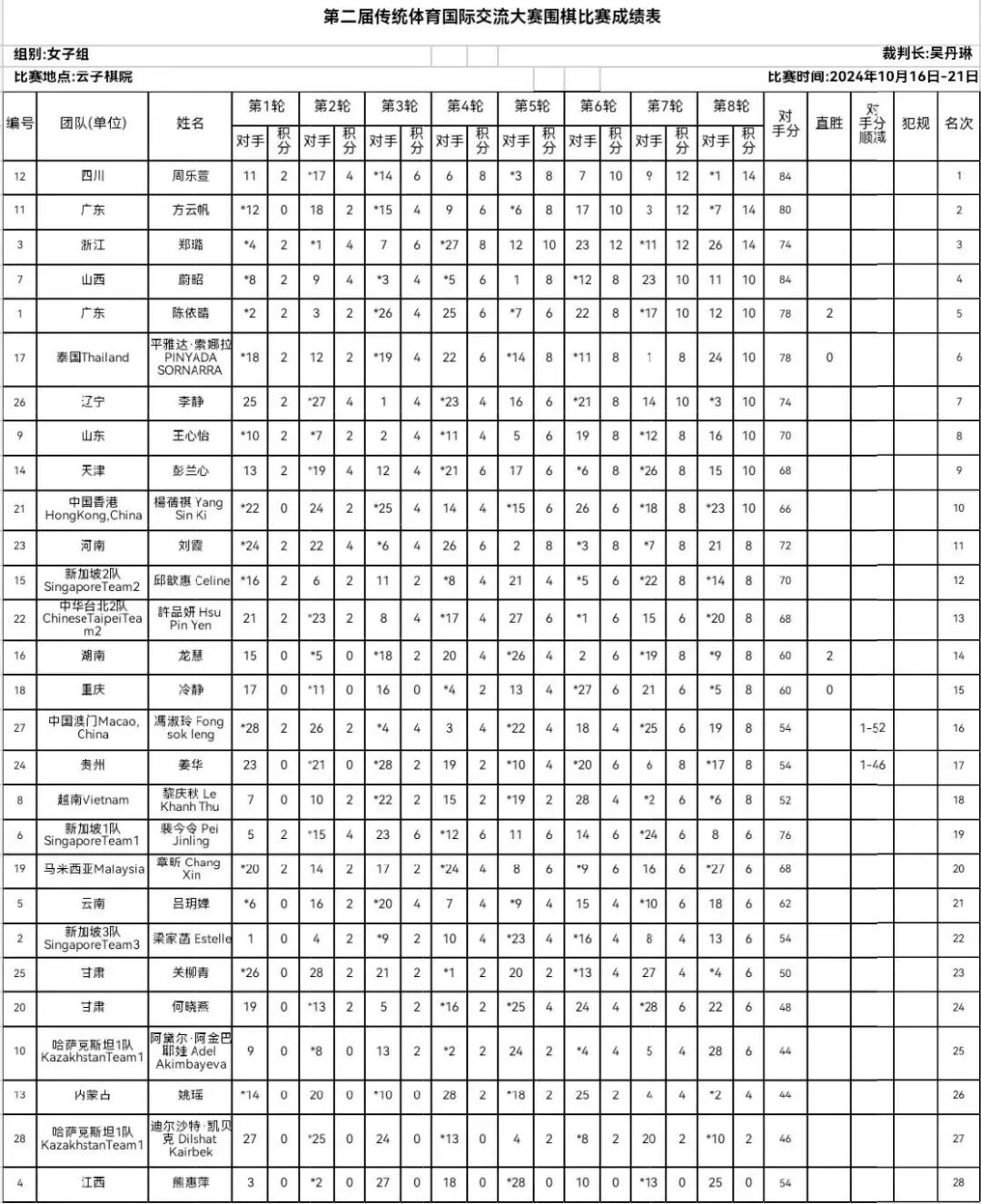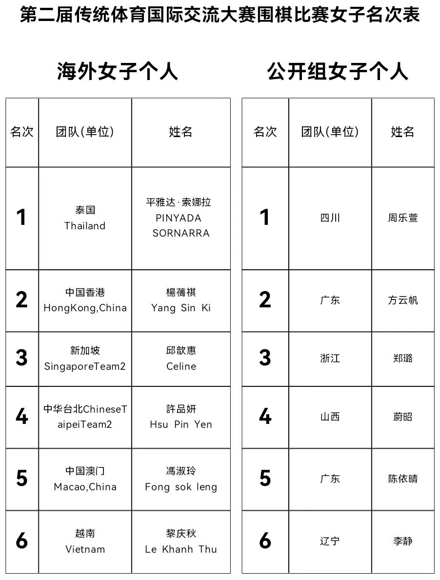 第二届传统体育国际交流大赛围棋比赛女子组获奖名单: