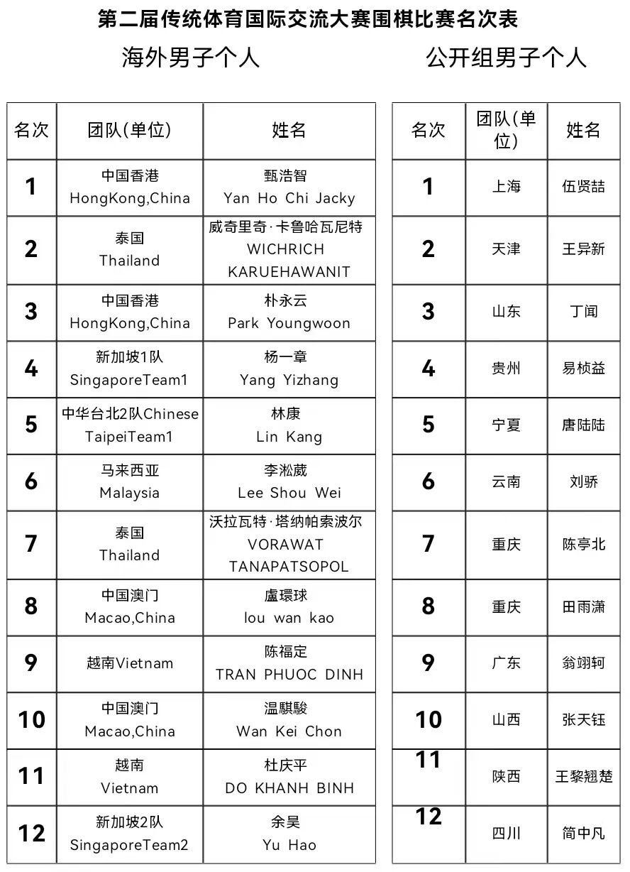 第二届传统体育国际交流大赛围棋比赛男子组名次表: