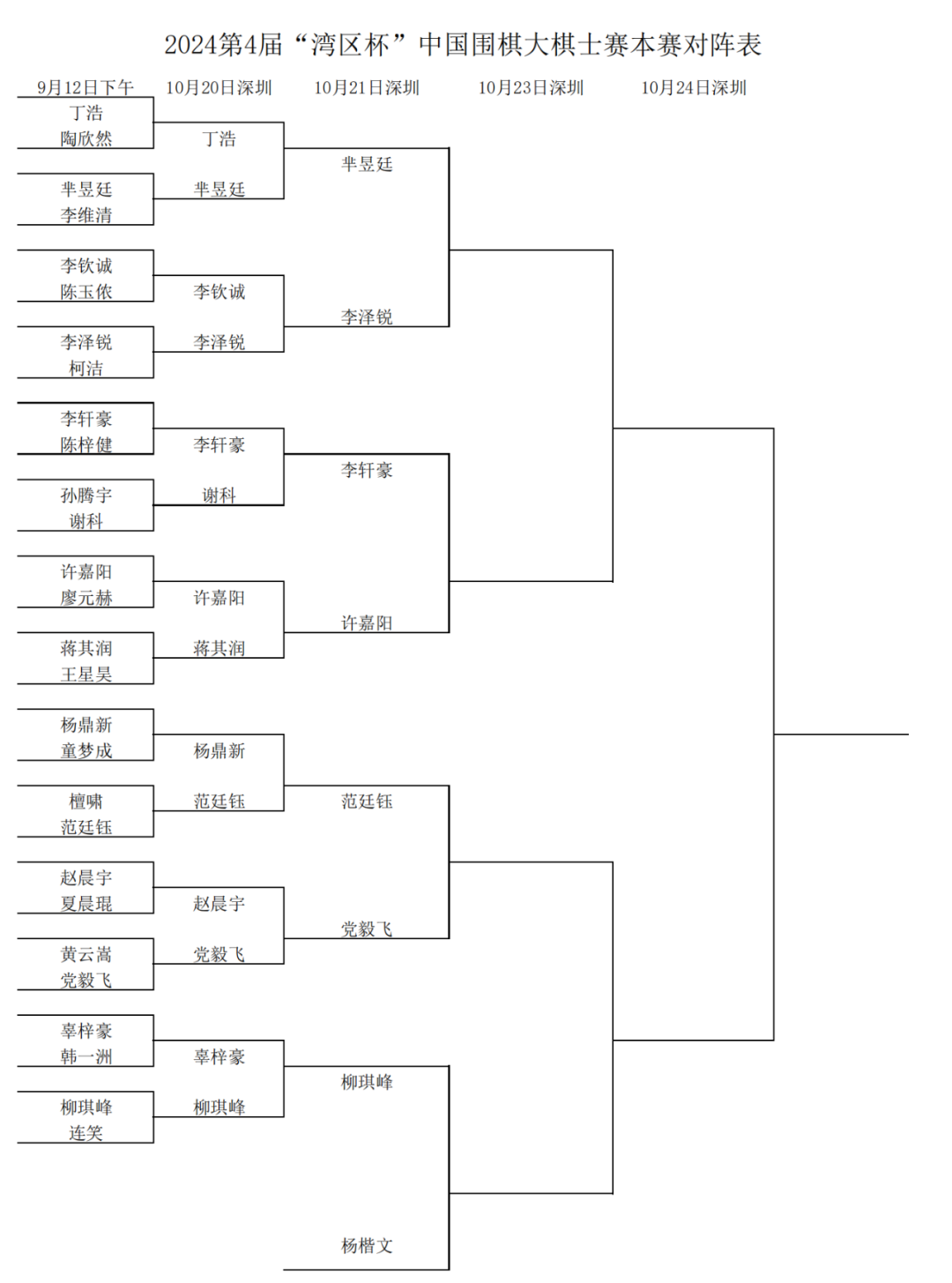 10月20日,2024第四届“湾区杯”中国围棋大棋士赛决赛阶段在深圳市宝安区1990文化馆开幕。在今天的比赛中,李轩豪、党毅飞等获胜,晋级8强。明天将举行8强赛。