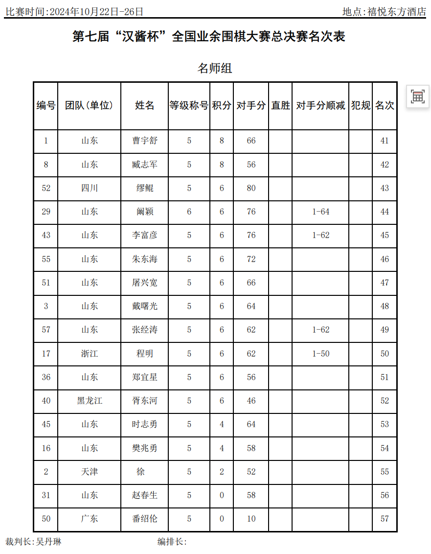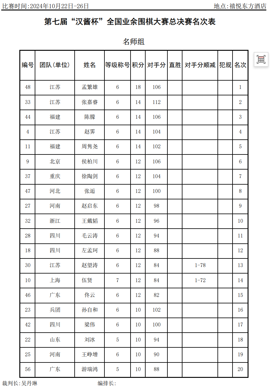 名师组1-6名名师组孟繁雄9战全胜获得冠军。张嘉睿最后一轮不敌周隽尧,总成绩7胜2负,但对手分全场最高、甚至高于冠军孟繁雄,获得亚军。陈朦也是7胜2负,通过比较对手分力压赵霁、周隽尧,获得季军。