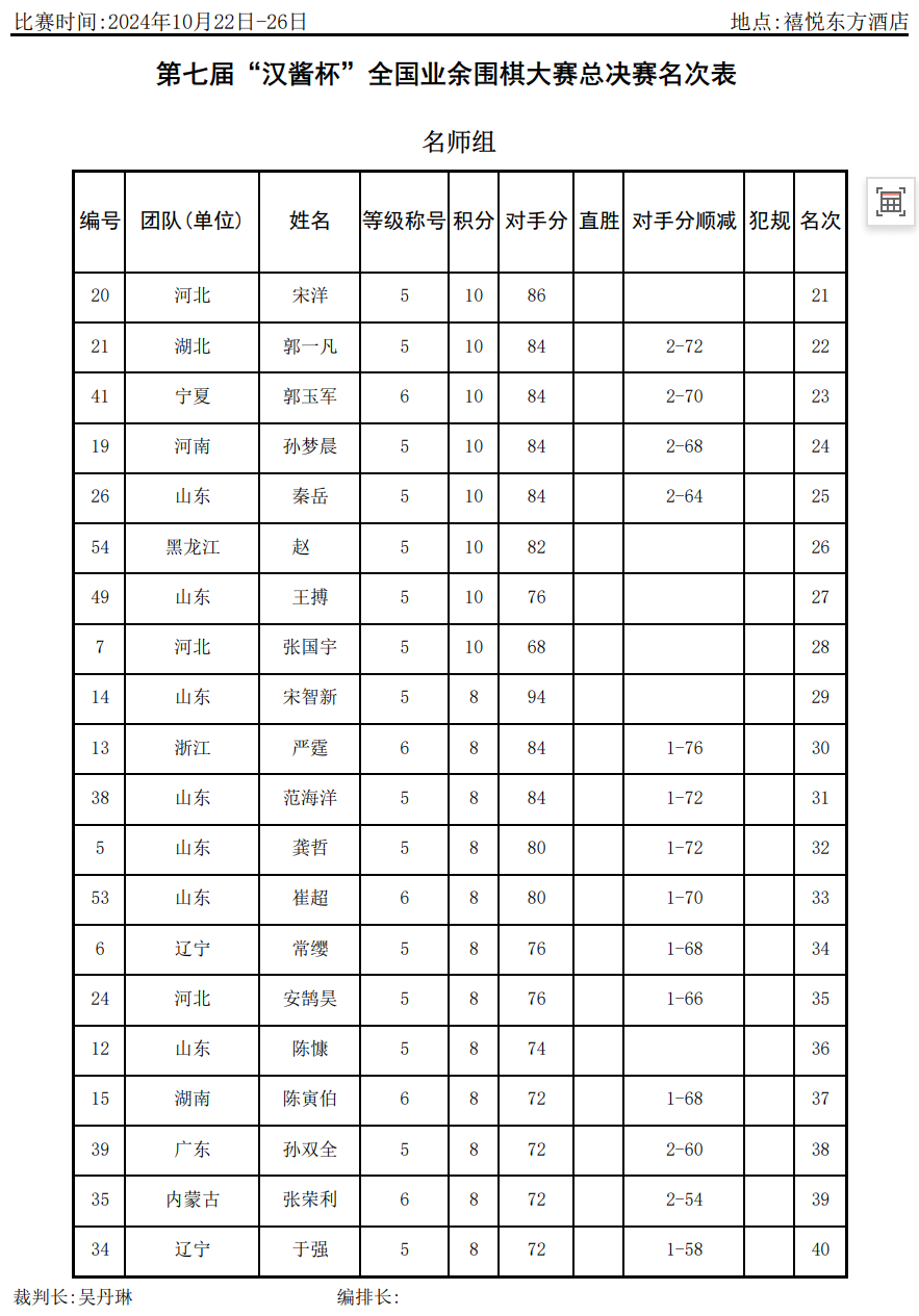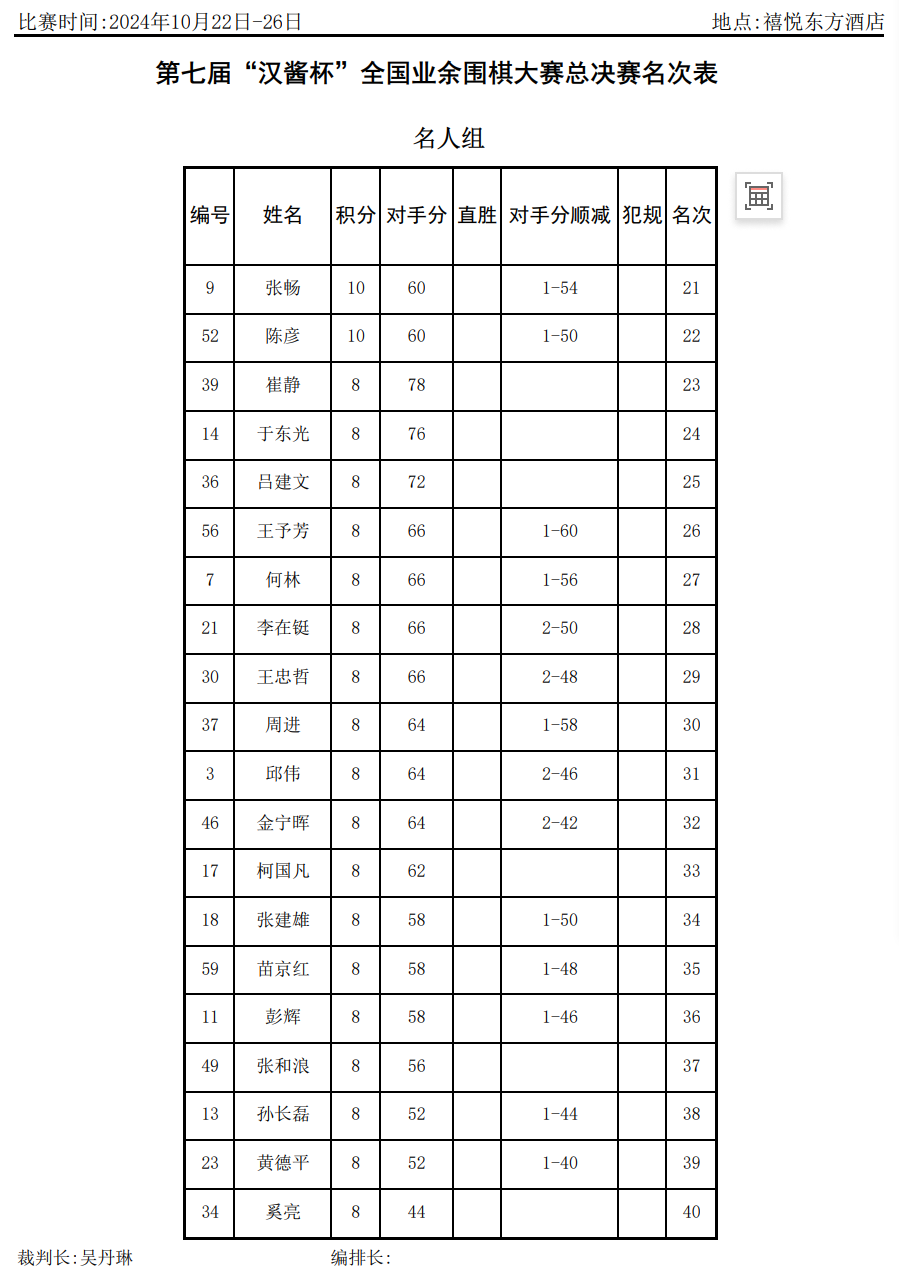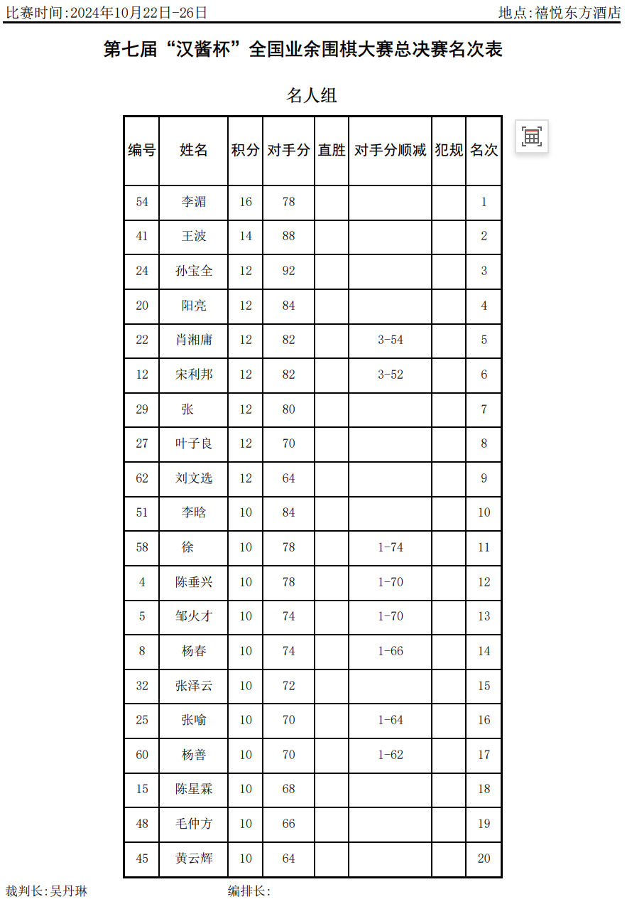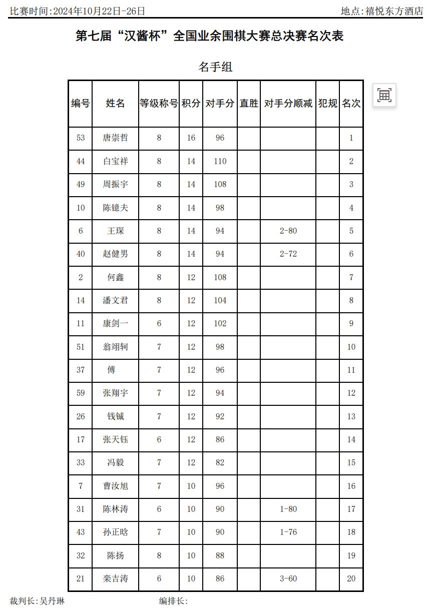 10月26日,第七届“汉酱杯”全国业余围棋大赛总决赛在山东济南禧悦东方酒店闭幕。唐崇哲、白宝祥、周振宇获得名手组前三名;孟繁雄、张嘉睿、陈朦获得名师组前三名;李湄、王波、孙宝权获得名人组前三名。