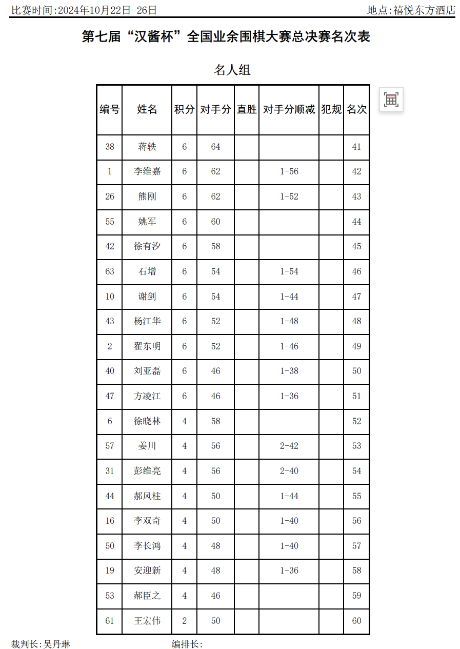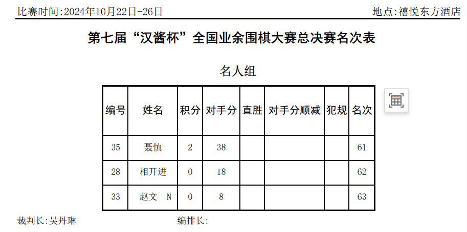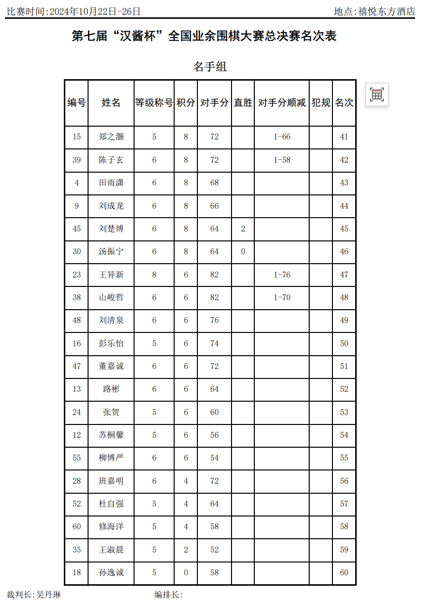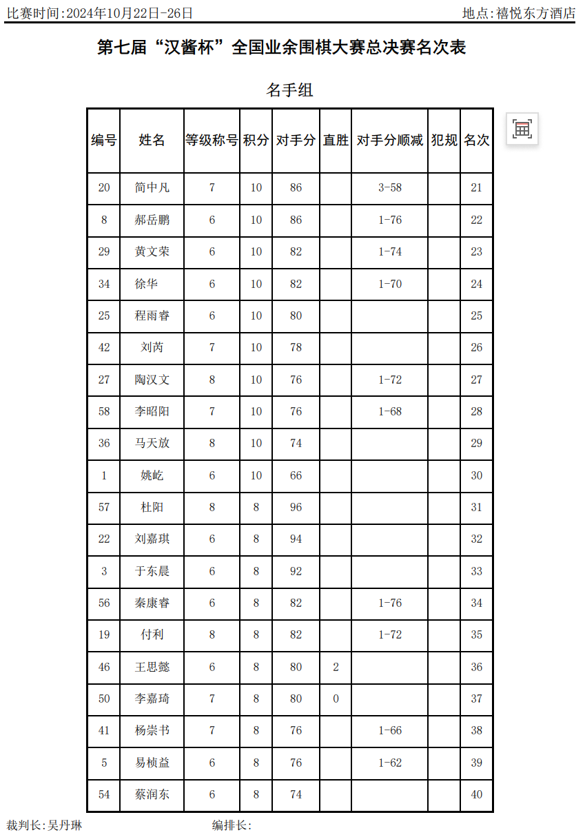 10月26日,第七届“汉酱杯”全国业余围棋大赛总决赛在山东济南禧悦东方酒店闭幕。唐崇哲、白宝祥、周振宇获得名手组前三名;孟繁雄、张嘉睿、陈朦获得名师组前三名;李湄、王波、孙宝权获得名人组前三名。