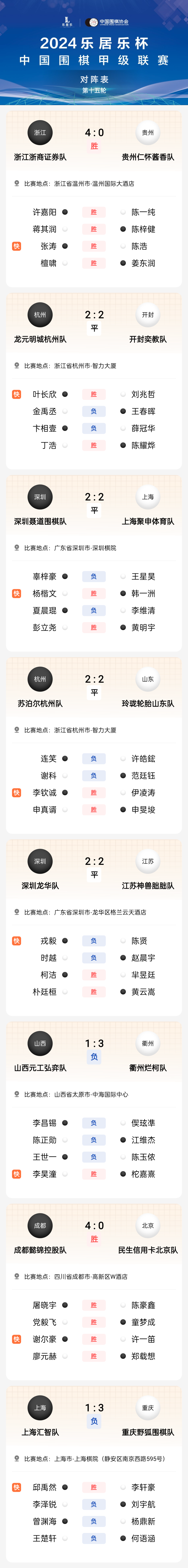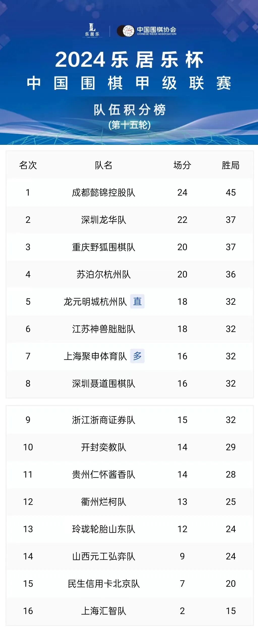 10月27日,2024乐居乐杯中国围棋甲级联赛常规赛第15轮即最后一轮在各主队主场结束。成都懿锦控股队、深圳龙华队获胜,依旧排在积分榜第一位、第二位;重庆野狐围棋队4:0战胜上海汇智队,积2分,超越苏泊尔杭州队,位列第三。常规赛战罢,成都懿锦控股队、深圳龙华队、重庆野狐围棋队、苏泊尔杭州队、龙元明城杭州队、江苏神兽朏朏队、上海聚申体育队、深圳聂道围棋队位列前八,将在季后赛争夺冠军;浙江浙商证券队、开封奕教队、贵州仁怀酱香队、衢州烂柯队、玲珑轮胎山东队、山西元工弘弈队、民生信用卡北京队、上海汇智队排名第9到第16位,将在季后赛为保级而战。今天下午14:00,蓝天四段搭档储可儿三段直播讲解檀啸九段对姜东润九段,最后檀啸逆转战胜姜东润。原本排在积分榜第10名的浙江浙商证券队4:0贵州仁怀酱香队,积2分,总积分为15分,很有希望进前八。但由于上海聚申体育队和圳聂道围棋队2:2打平,各积1分,总积分均为16分,浙江浙商证券队排名第9,无缘季后赛的冠军争夺。