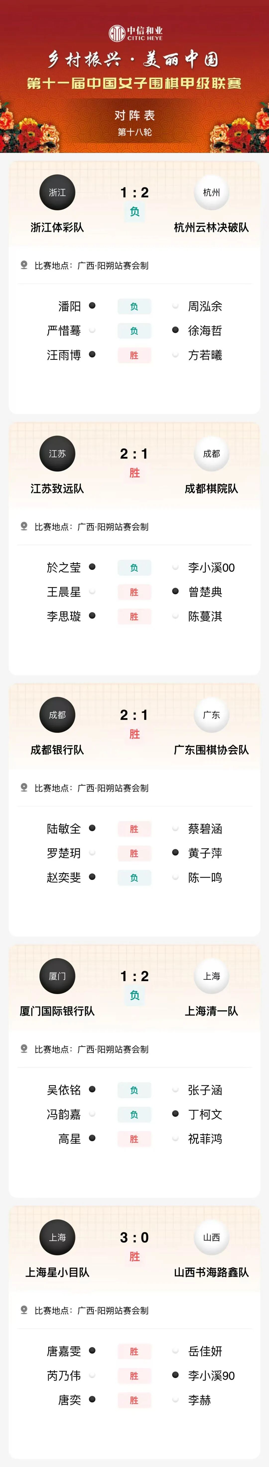 11月9日,2024年第十一届“中信和业杯”中国女子围甲联赛第18轮即最后一轮比赛在广西桂林阳朔结束。提前三轮夺冠的成都银行队今天再胜,分数创联赛新纪录;上海星小目队在亚军争夺战中胜出;杭州云林决破队获得第三名。罗楚玥、唐嘉雯、吴依铭在个人排行榜上位居前三。本赛季的女子围甲联赛在安徽蚌埠启幕。第一个赛会制三轮比赛过后,厦门国际银行队、杭州云林决破队、成都银行队同为3连胜占据积分榜前三位。第四轮迎来强强对话,成都银行队远赴厦门大学客场挑战厦门国际银行队,虽然联赛头号外援吴侑珍不敌吴依铭,但陆敏全、罗楚玥获胜,2:1力克强敌。但第四轮同样获胜的杭州云林决破队以多胜1局的局分优势排在积分榜首位。第五轮杭州云林决破队0-3大败于上海星小目队,成都银行队3:0大胜浙江体彩队之后,开始领跑积分榜。