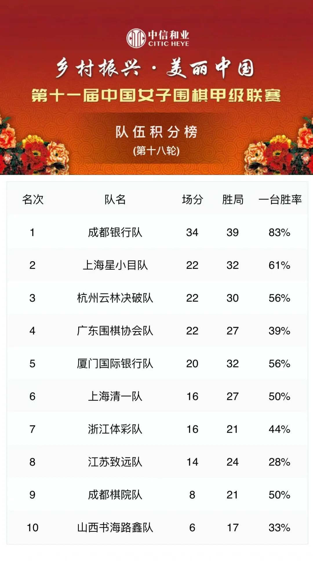 第十一届“中信和业杯”中国女子围甲联赛最终积分榜: