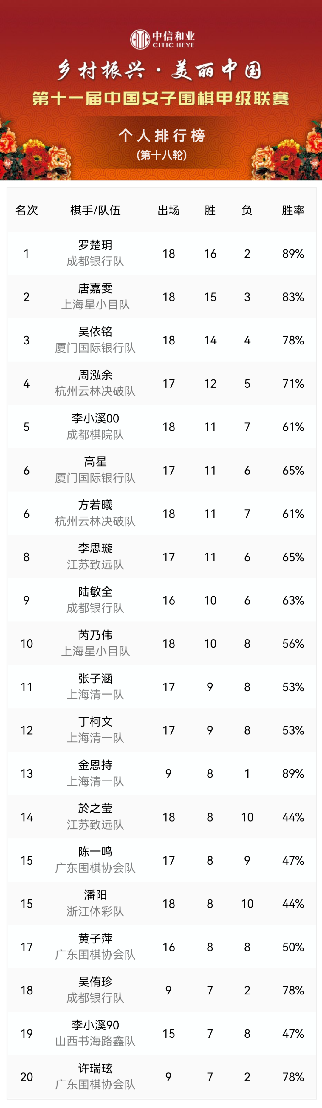第十一届“中信和业杯”中国女子围甲联赛个人排行榜:
