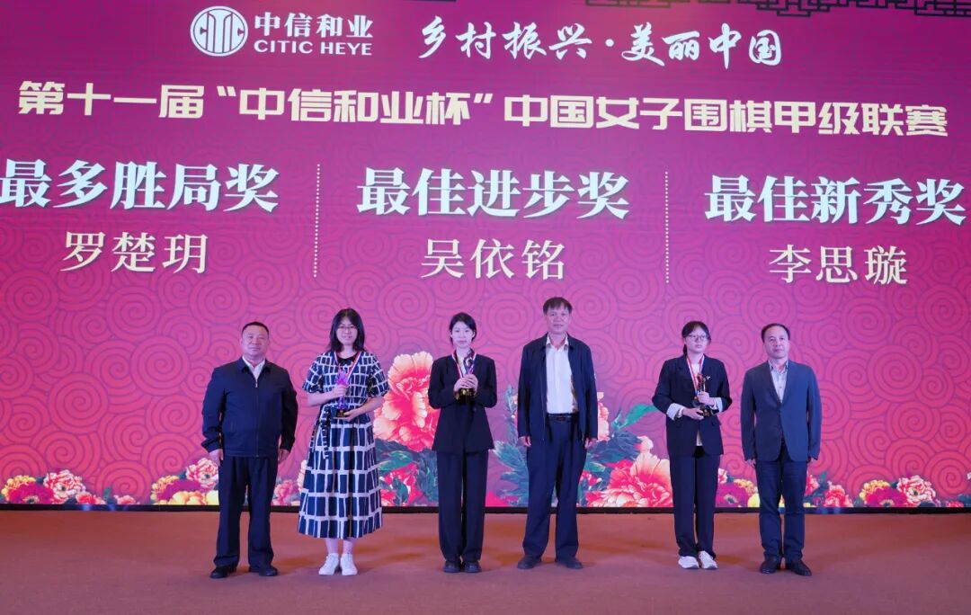 宋巍在致辞中说:“联赛由中信集团与中国围棋协会共同主办,经过十余年的培育与创新,已具备独特的品牌价值。这项赛事不仅见证了中国女子围棋事业的发展和进步,而且也记录着中信集团和中国围棋协会多年来并肩携手,共同为围棋事业鼓与呼的点点滴滴。借此机会向中国围棋协会表示衷心的感谢。”“今年是中信集团成立45周年,45年来中信集团已发展成为一家产融结合的大型综合性跨国企业集团,拥有23万余名员工,总资产超11.6万亿元、净利润超千亿元,世界500强排名第71位。中信和业是中信集团一级子公司,是集团新型城镇化板块商业地产运营管理专业平台,持有运营及受托管理的资产涵盖北京、广州、重庆、沈阳、苏州、青岛、珠海等全国10余个城市,总资产超千亿元。在未来的岁月里,中信集团和中信和业将继续携手中国围棋协会,办好联赛,支持传统文化的赓续发展。”罗楚玥六段前十轮一马当先,保持全胜,最终个人总战绩为16胜2负,为成都银行队提前三轮夺冠立下头功,获得“最佳棋手奖”实至名归。同时,16胜2负的数据也让她获得“最多胜局奖。