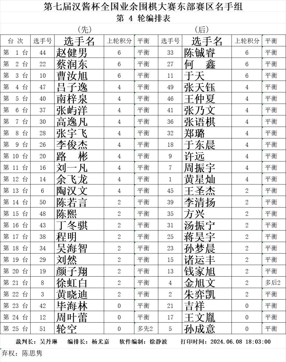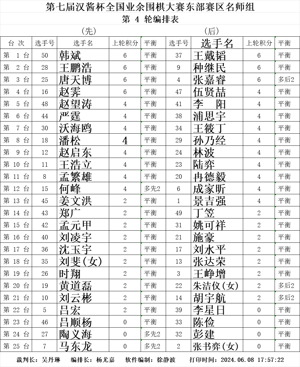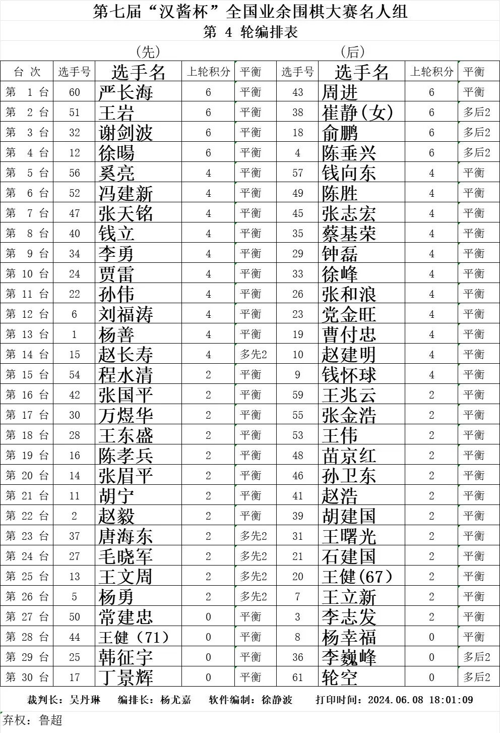 6月8日,第七届“汉酱杯”全国业余围棋大赛东部赛区开幕式在江苏省南京市白金汉爵大酒店举行。当日,各组进行了三轮比赛,名手组的曹汝旭等6人、名师组的韩斌等7人、名人组的严长海等8人取得三连胜。明天将进行各组第四、第五、第六轮比赛。