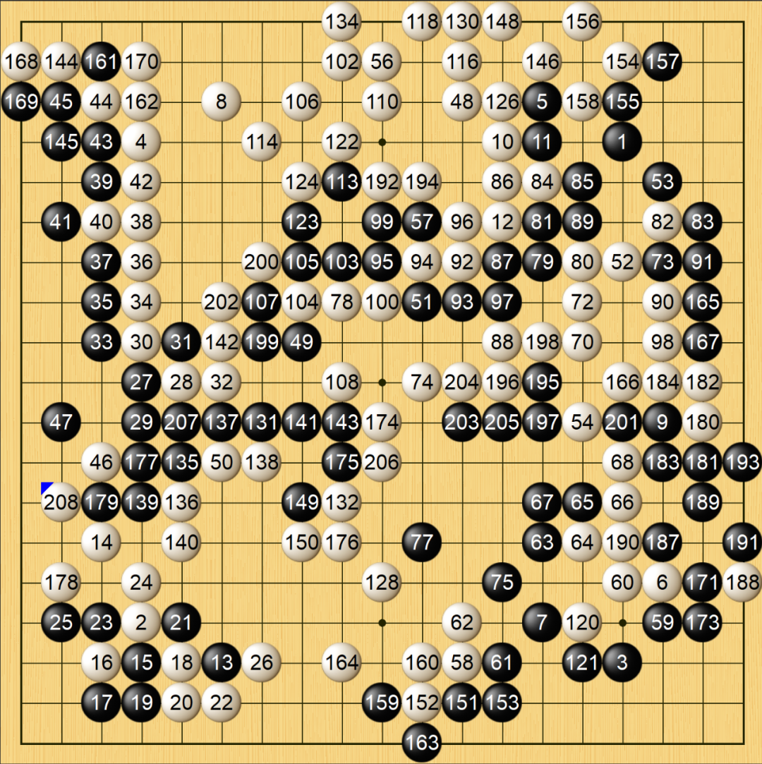 至208手,范廷钰中盘认输,韩国队第二将金明训取得三连胜。