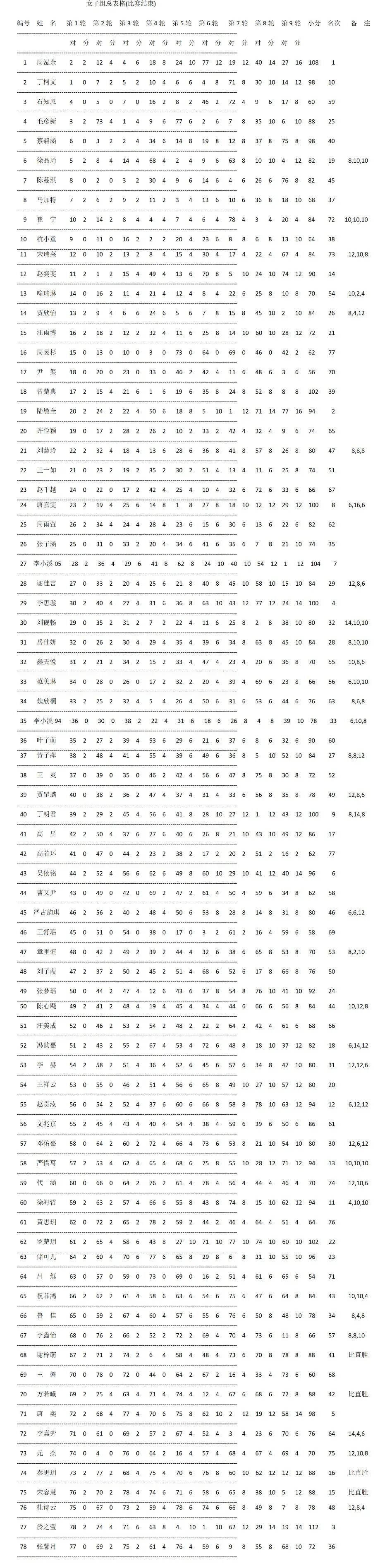 周泓余和陆敏全均为8胜1负,周泓余凭借对手分优势成功摘得女子组第一名的桂冠,陆敏全位居第二名。於之莹、李思璇、唐奕、吴依铭均为7胜2负,根据对手分依次位列女子组第三至六名。