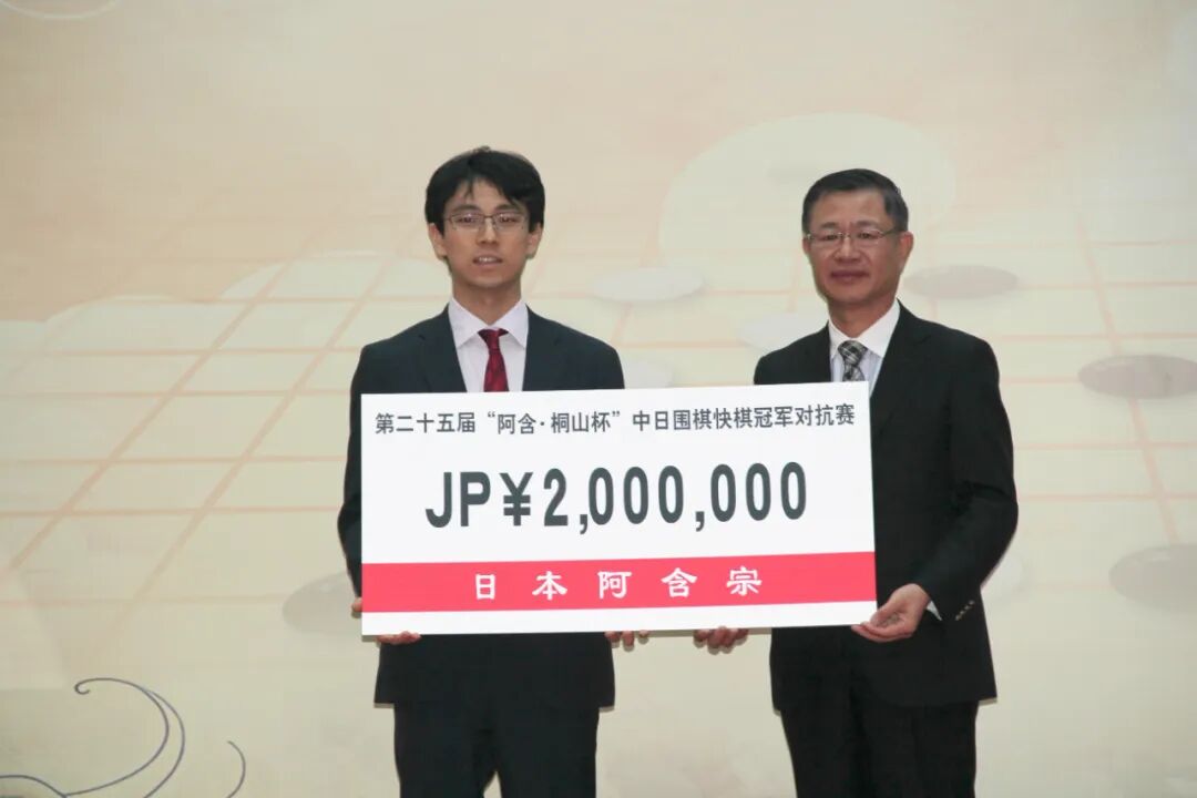 至270手,虽然棋盘上的差距不大,但一力辽无心再战,中盘认输。今年3月27日举行的第24届对抗赛中,一力辽不敌杨鼎新;更早的第20届对抗赛不敌辜梓豪;三次出场未尝胜绩。25次中日冠军对抗赛,日本冠军在前4次取得连胜,从第5次开始鲜有胜绩,只有井山裕太在第17次对抗、张栩在第21次对抗扳回两局,总比分6:19落后。赛后举行了颁奖仪式,中国围棋协会主席常昊,中国围棋协会名誉主席 华以刚,中国国际友好联络会副秘书长周新政,日本棋院理事长武宫阳光,日本阿含宗中国事务局局长史学军,西安市体育局局长马锐等出席,并为两位参赛棋手颁奖。