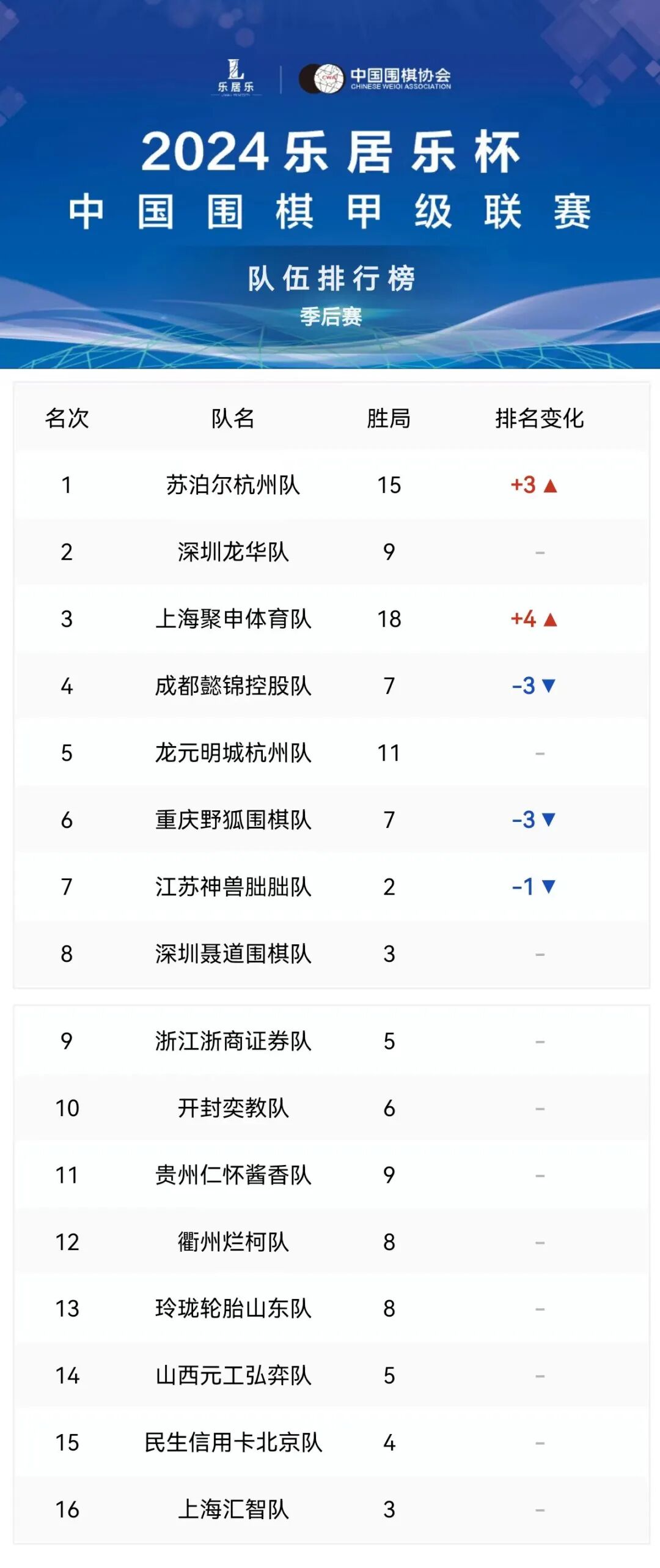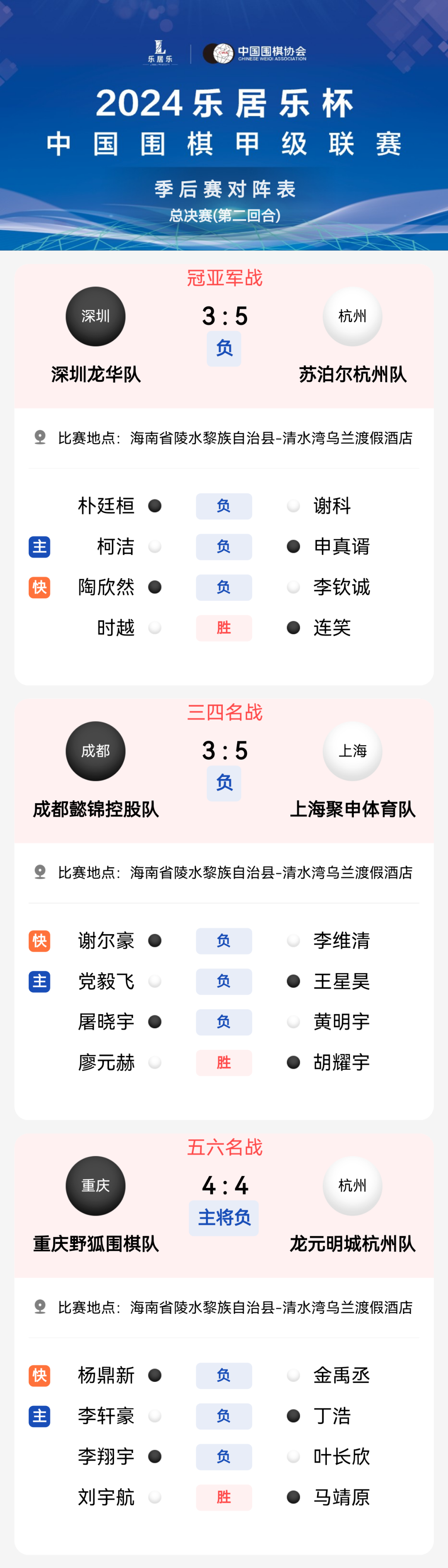 1月13日,2024乐居乐杯中国围棋甲级联赛总决赛第二回合比赛在海南清水湾乌兰度假酒店结束。焦点战申真谞逆转柯洁保持赛季全胜,苏泊尔杭州队在第二回合3:1深圳龙华队、总比分5:3获胜,第七次夺得围甲联赛冠军。上赛季冠军深圳龙华队屈居亚军,上海聚申体育队获得季军,成都懿锦控股队、龙元明城杭州队、重庆野狐围棋队分获第四至六名。明天将举行本赛季联赛颁奖仪式暨闭幕式。总决赛第一回合冠军之战、季军之战都打成2:2平,奖牌之争全在今日。