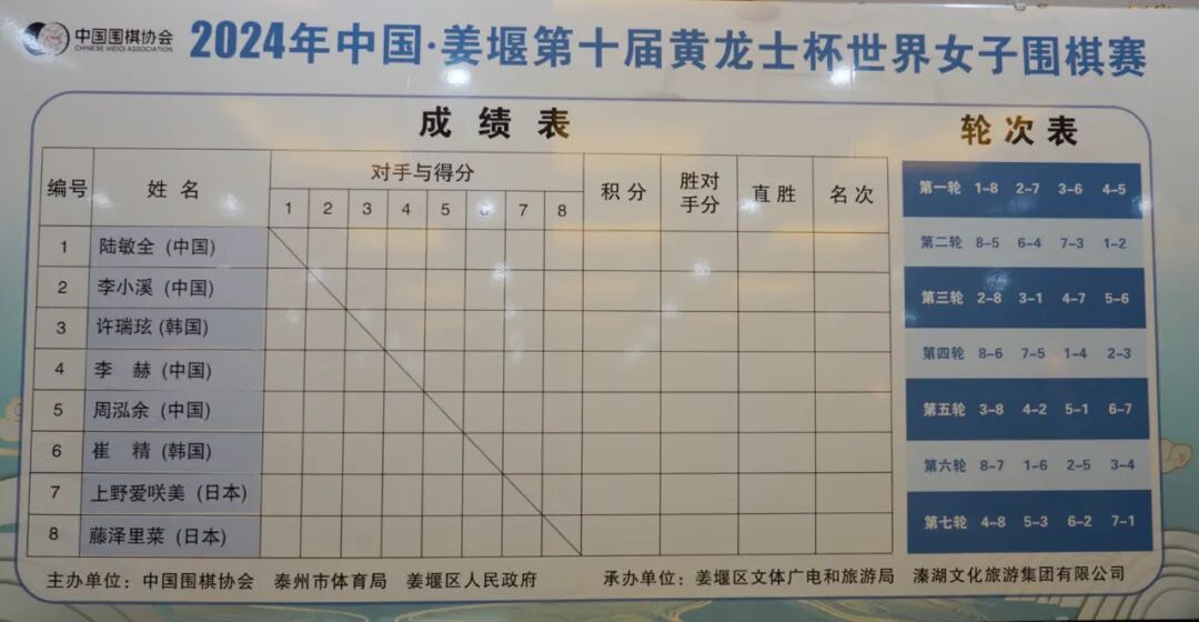2024年中国姜堰第十届黄龙士杯世界女子围棋赛由中国围棋协会、泰州市体育局、姜堰区人民政府主办,姜堰区文体广电和旅游局、溱湖文化旅游集团有限公司承办。4名中国棋手、2名日本棋手、2名韩国棋手参赛。比赛采用单循环赛制,8位棋手通过7轮单循环赛决出冠亚军。每局胜者记2分,负者记0分。如遇三劫循环等特例,该局按和棋处理,每人记1分。积分高者名次列前,如遇积分相同,依次比较所胜对手积分、直胜;如以上办法不能决出冠亚军,则采用抽签定位方式加赛快棋,用时方式为每方3次30秒读秒;其他名次允许并列。比赛采用中国围棋竞赛规则,黑方贴3又3/4子。用时方式为每方2小时后五次1分钟读秒,超时判负。冠军奖金30万元,亚军奖金10万元,每局胜方对局费0.8万元,负方对局费0.3万元。对局日为6月20、21、22、24、25、26、27日。