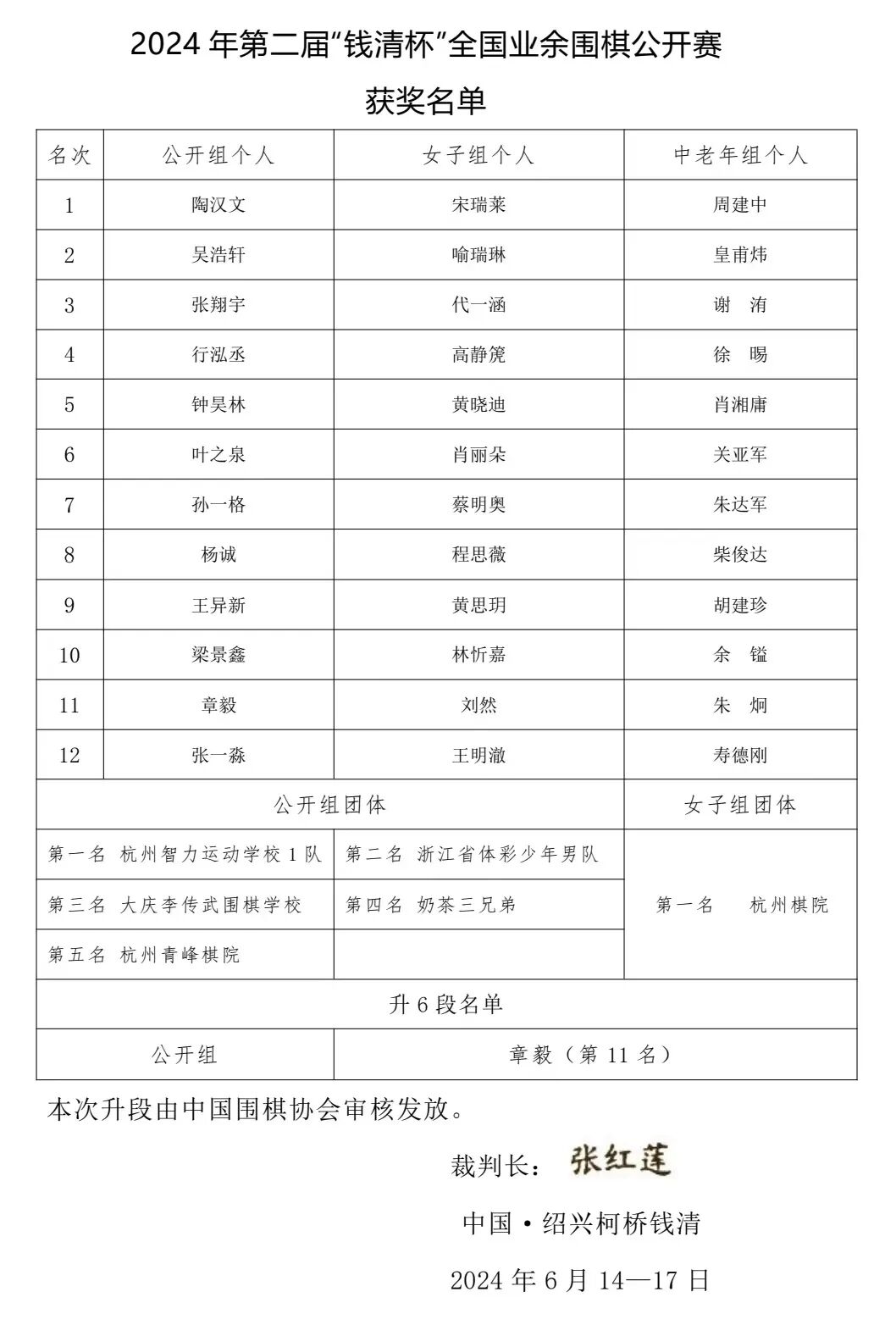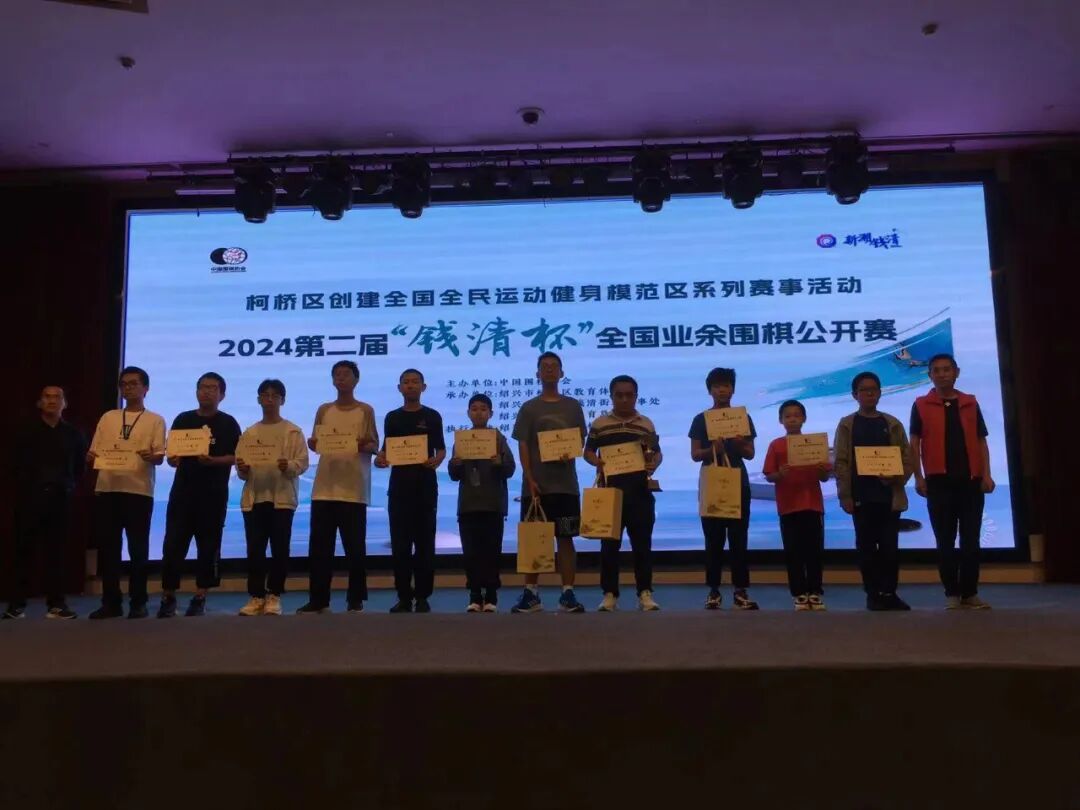 第二届“钱清杯”全国业余围棋公开赛于17日在浙江省绍兴市柯桥区闭幕,陶汉文、吴浩轩、张翔宇获得公开组个人前三名,宋瑞莱、喻瑞琳、代一涵获得女子组个人前三名,周建中、皇甫炜、谢洧获得中老年组个人前三名,杭州智力运动学校1队、浙江省体彩少年男队、大庆李传武围棋学校获得公开组团体前三名,杭州棋院队获得女子组团体第一名。获得公开组第11名的章毅升为6段。