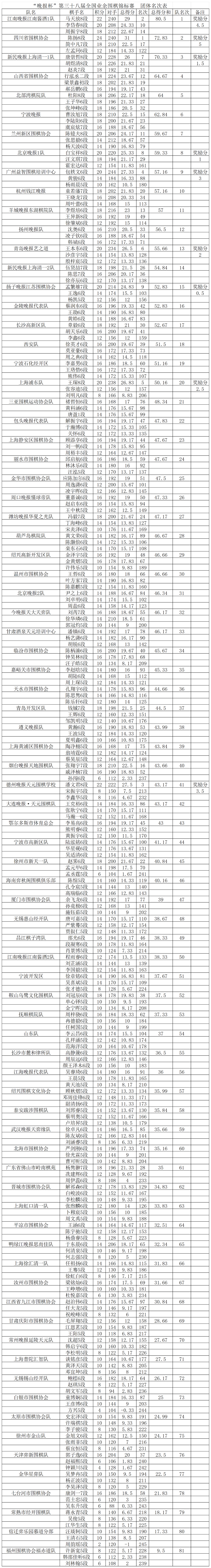 1月16日,第三十八届“晚报杯”全国业余围棋锦标赛在江苏省无锡市中威蓝海御华大饭店结束。陈扬获得个人赛冠军,马天放、潘文君分列第二、三位。江南晚报江南酱酒1队、四川省围棋协会、新民晚报上海清一1队位列团体前三名。本次比赛共13轮,陈扬8段以12胜1负的佳绩夺得个人赛冠军;马天放8段、潘文君8段同为11胜2负,通过比较对手分依次排列第二、三名。比赛还设立了单项奖:虞宸炫7段、邱启航6段、梁铭灿6段位列13岁及以下组前三名;孟繁雄7段、李岱春8段、胡煜清8段位列40-49岁组前三名;邵光6段、韩斌6段、严剑刚6段位列50岁及以上组前三名;陈思7段、王珞惜6段、童博娴5段位列女子组前三名。