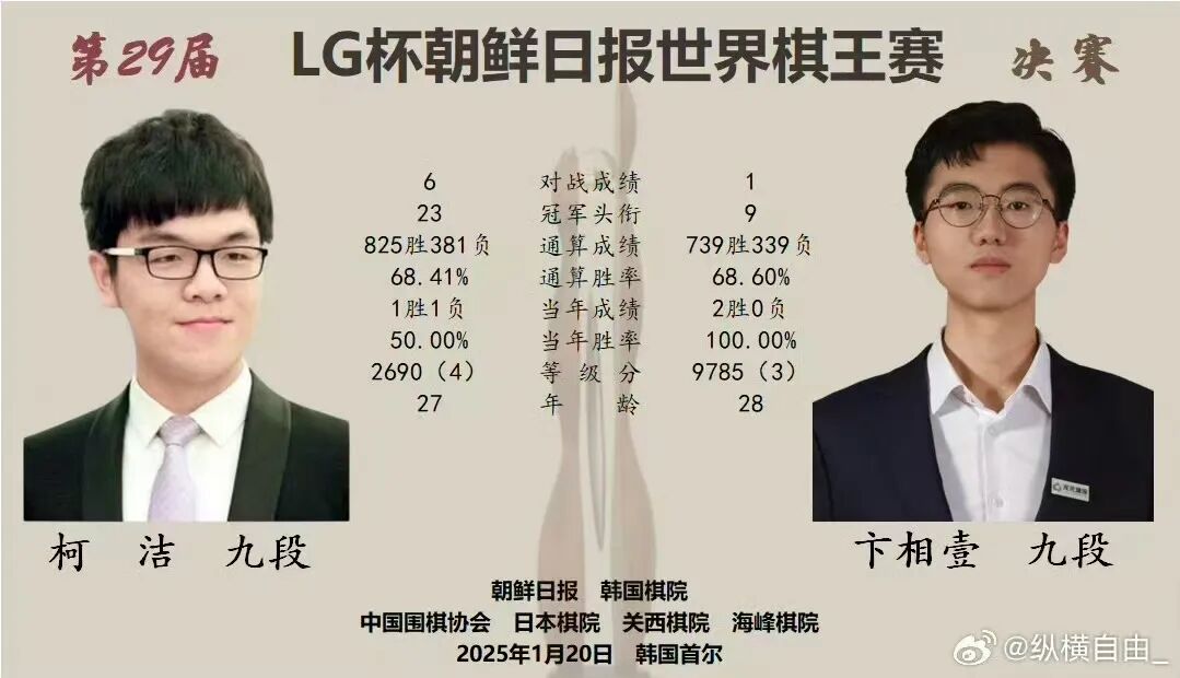 2025年1月20日,第29届LG杯世界围棋棋王战决赛将在韩国首尔开赛,中国棋手柯洁九段迎战韩国棋手卞相壹九段,冲击个人的第九个世界冠军,若获胜则成为中国独一无二的“九冠王”。