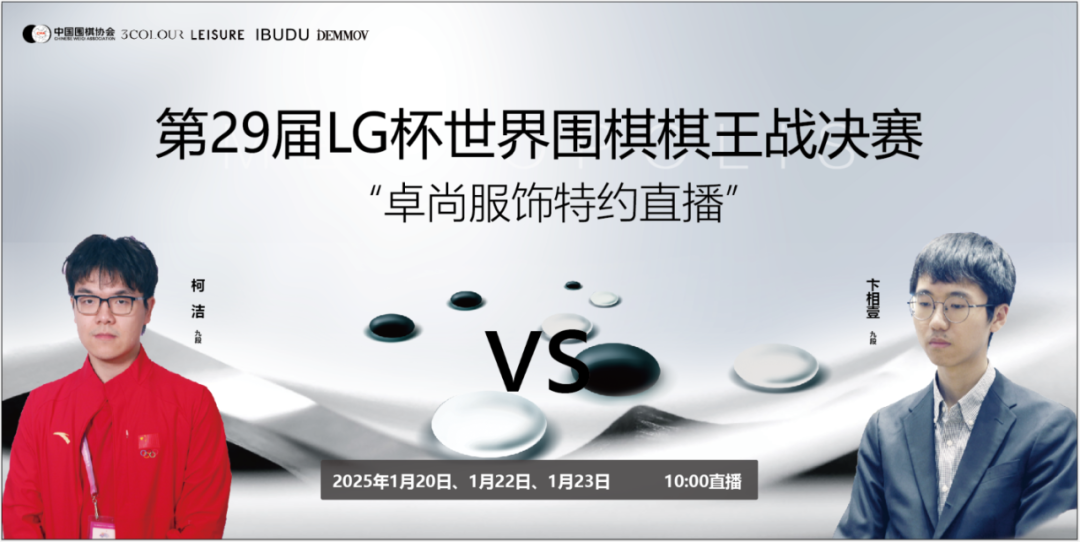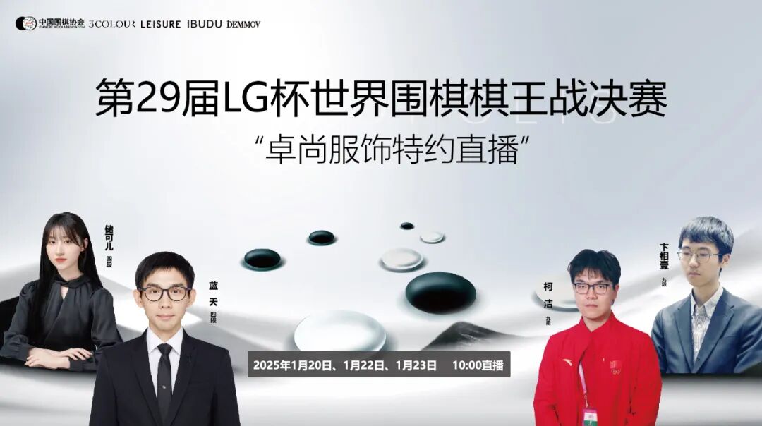 LG杯决赛为三番棋,比赛日为1月20日、22日、23日。每个比赛日的北京时间9:00开赛,中国围棋协会在抖音、bilibili、视频号的官方账号从10:00开始直播,由蓝天四段、储可儿四段解说。参与直播互动的棋迷,有机会获得由品牌服装提供的时尚女装。